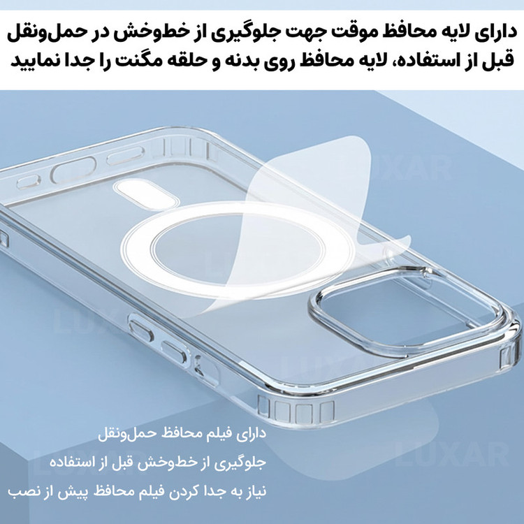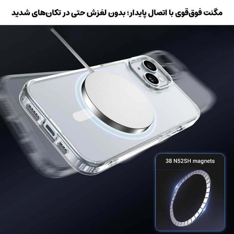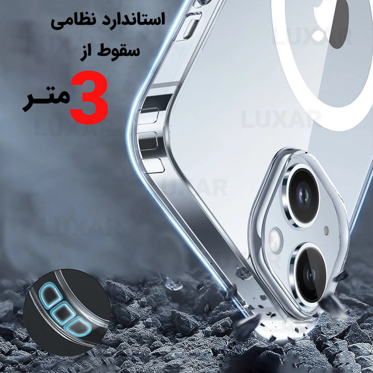 استاندارد نظامی سقوط از ارتفاع ۳ متر - عدم تغییر رنگ - محافظت از لنز گوشی- متریال شفاف با دوام بالا - بدون تغییر رنگ -دارای بامپر در گوشه های کاور - پشتیبانی از MagSafe برش های دقیق