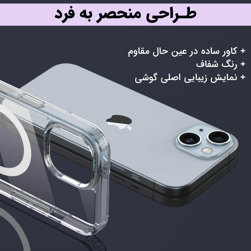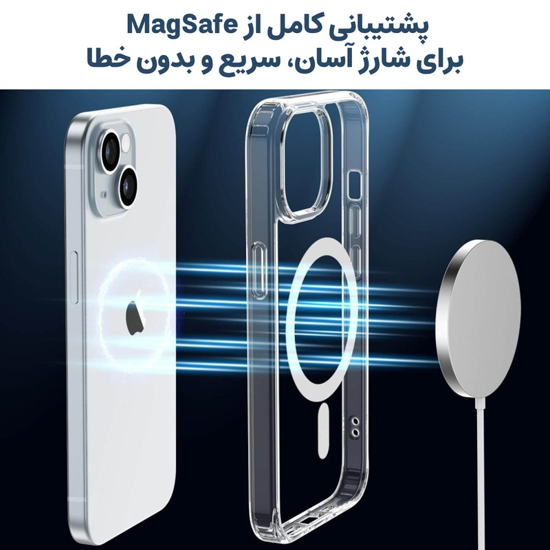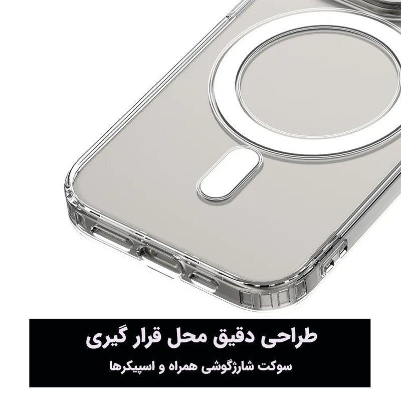 استاندارد نظامی سقوط از ارتفاع ۳ متر - عدم تغییر رنگ - محافظت از لنز گوشی- متریال شفاف با دوام بالا - بدون تغییر رنگ -دارای بامپر در گوشه های کاور - پشتیبانی از MagSafe برش های دقیق