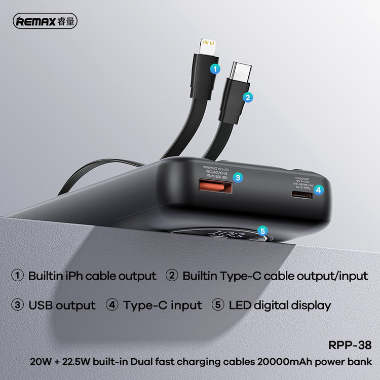 پاوربانک ریمکس مدل RPP-38 ظرفیت 20000 میلی آمپر ساعت