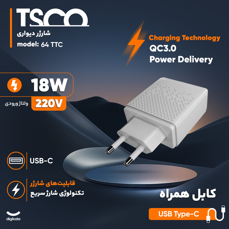 شارژر دیواری ۱۸ وات تسکو مدل TTC 64 همراه با کابل USB Type-C، یک محصول کاربردی و جمعوجور برای شارژ گوشیها و تبلتها است. این شارژر با وزن ۸۰ گرم و بدنهای از جنس پلاستیک، سبک و مقاوم طراحی شده و استفاده روزمره را راحت میکند. اتصال آن به منبع برق از طریق دوشاخه استاندارد ایران انجام میشود و برای استفاده در خانه، محل کار یا سفر مناسب است.