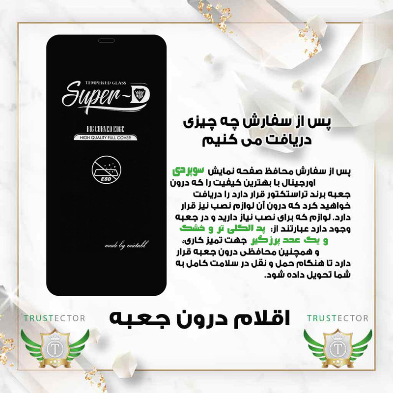 مشخصات دیگر : - دارای پوشش تمام چسب صفحه نمایش - سازگاری با تمامی کیس و کیف های موجود - دارای سختی ۹H و مقاوم در برابر خط و خش و ضربه - مقاوم در برابر اثر انگشت، قطرات آب، چربی - عدم کاهش حساسیت تاچ صفحه نمایش - مقاوم در برابر ایجاد حباب - نصب آسان - بسته بندی شکیل