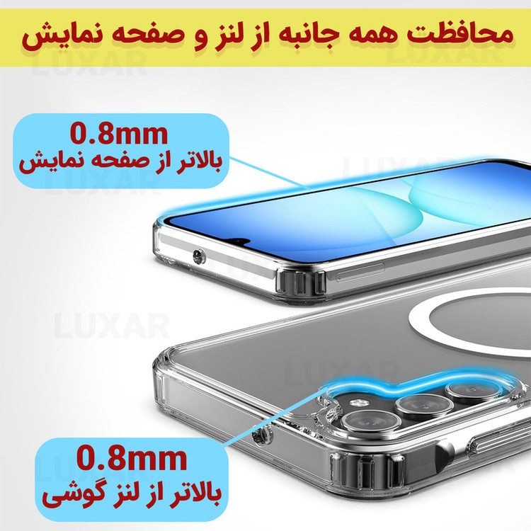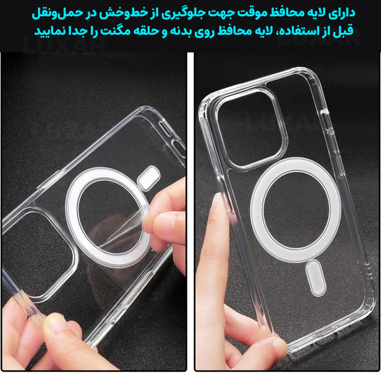 استاندارد نظامی سقوط از ارتفاع ۳ متر - عدم تغییر رنگ - محافظت از لنز گوشی- متریال شفاف با دوام بالا - بدون تغییر رنگ - پشتیبانی از MagSafe برش های دقیق