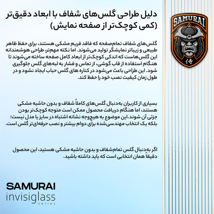 گلس شیشهای سامورایی مدل InvisiGlass مناسب برای گوشی سامسونگ Galaxy S25 Ultra، با طراحی تمام صفحه و بدون حاشیه، کاملاً فیت روی نمایشگر قرار میگیرد بدون آنکه با قاب یا لبهها تداخل داشته باشد. این گلس با سختی 9H، در برابر خط و خش و ضربه مقاوم است و از صفحهنمایش گوشی Samsung Galaxy S25 Ultra شما به خوبی محافظت میکند. پوشش الئوفوبیک پیشرفته آن، لمس روان و مقاوم در برابر اثر انگشت را تضمین مینماید. اگر بهدنبال یک محافظ صفحه شفاف با کیفیت بالا و نامرئی هستید، InvisiGlass انتخابی حرفهای و مطمئن برای شماست.