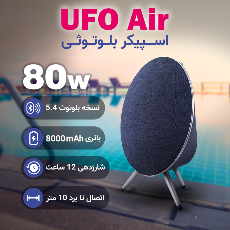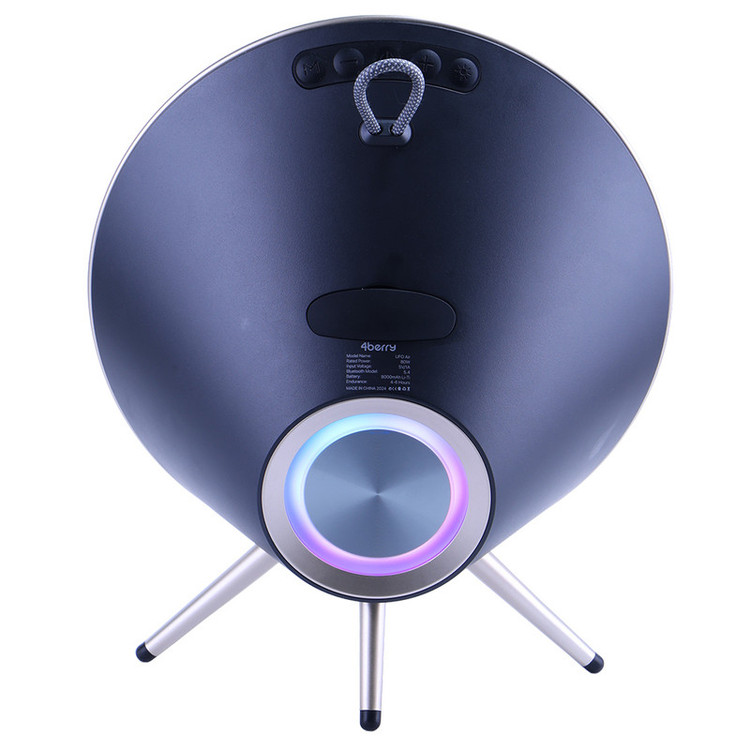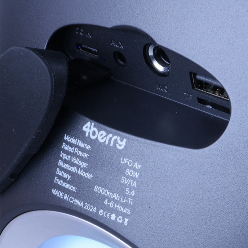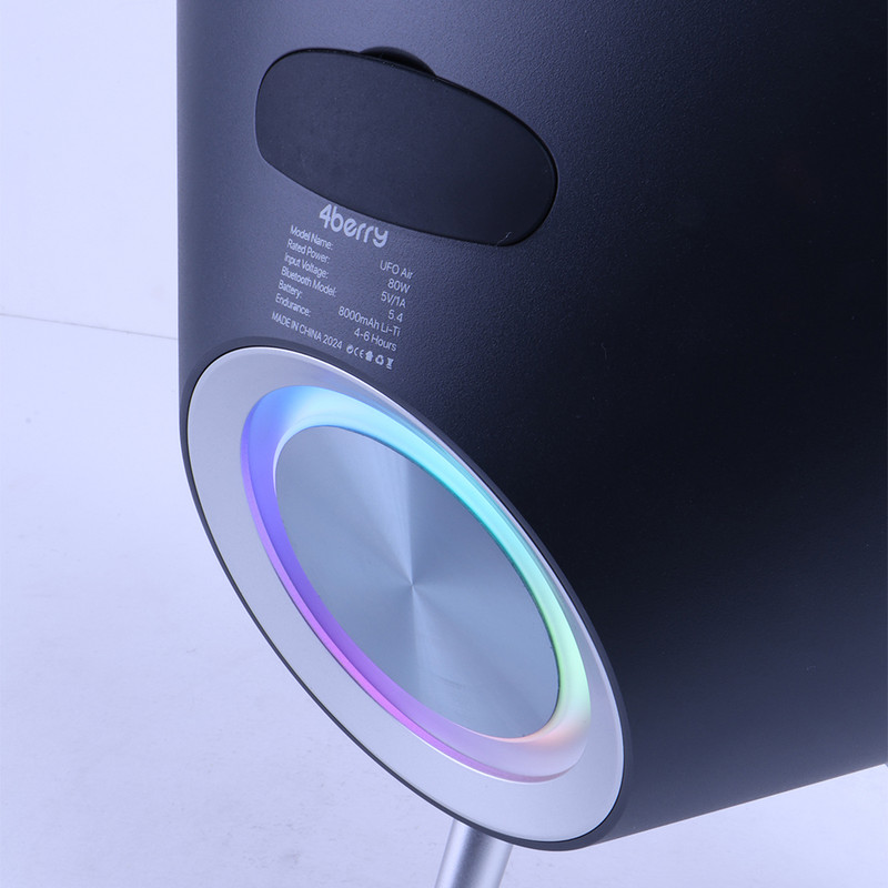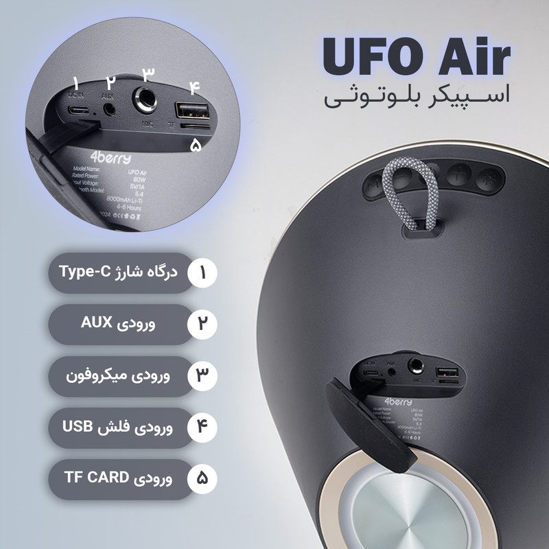 اسپیکر بلوتوثی و قابل حمل فوربری مدل UFO Air با طراحی جذاب و انواع راههای اتصالی از قبیل بلوتوث، سیم AUX، فلش USB، مموری SD Card و کارائوکی؛ دارای ظرفیت باتری ۸۰۰۰ میلیآمپرساعتی و همچنین توان خروجی ۸۰ وات و بیس ۵۰ وات!