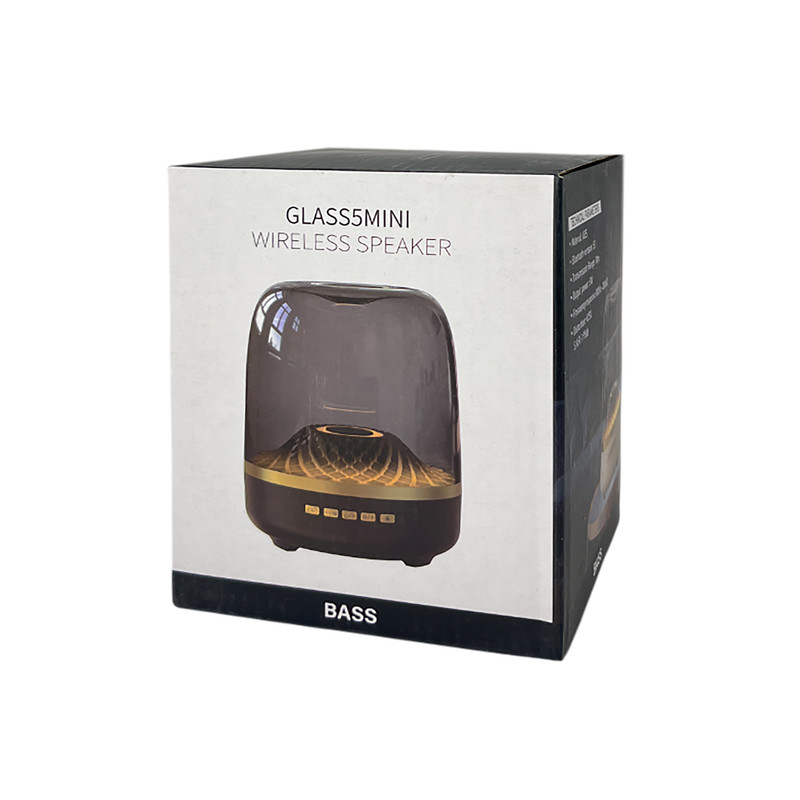 اسپیکر GLASS 5 MINI در میان دیگر اسپیکرهای هم رده خود از کیفیت بالاتری برخوردار است. این اسپیکر بلوتوثی با طراحی 360 درجه، قابلیت نمایش موسیقی را در سراسر اتاق فراهم میکند. به طوری که اگر آن را در وسط اتاق قرار دهید صدا به اندازه یکسانی در فضا پخش می شود و با نور RGB که داخل محفظه شیشه ای آن قرار دارد محیطی جذابی برای شما به نمایش میگذارد. در پشت اسپیکر شما می توانید سوکت برق TYPE-C،ورودی درگاه TF و پورت AUX را مشاهده کنید. اگر بلندگو را وارونه کنید؛ می بینید که یک ووفر در پایین آن قرار دارد که صدایی با کیفیت بیشتر از انتظار شما تولید میکند. اتصال بلوتوثی یکی از روشهای محبوب برای اتصال دستگاهها به اسپیکر است. پشتیبانی از بلوتوث ورژن 5.1، با حداکثر فاصله 10متر میتواند اتصال دقیق و پایداری را برای شما فراهم کند. به این ترتیب، شما میتوانید به راحتی گوشیهمراه، تبلت و لپتاپ خود را به اسپیکر متصل کنید. علاوه بر اتصال بلوتوثی، با قرار دادن یک درگاه AUX، امکان اتصال سیمی نیز در اختیار شما قرار میگیرد.