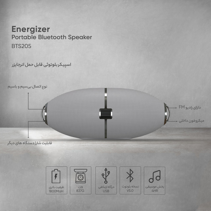این اسپیکر بلوتوث با الهام از توپ راگبی طراحی شده است و طراحانان اسپیکر BTS205 با این ظاهر قدرت این اسپیکر را به رخ کشیدهاند. علاقه مند به گوش دادن موسیقی در هر زمان و مکانی هستید؟ آیا شما هم همیشه یک فلش مموری با آهنگ های مورد علاقه خود را همراهتان دارید؟ با اسپیکر بلوتوث مدل BTS205 انرجایزر میتوانید در هر جا به موزیکهای داخل فلش مموری خود گوش کنید. توان 10 واتی این اسپیکر تضمین کننده صدایی با کیفیت و صاف است و با فرکانس 30Hz-20kHz هرتز خود محدوده شنوایی شما را پوشش میدهد. علاوه بر فلش مموری که در بالا اشاره شد اسپیکر بلوتوث انرجایزر از رم میکرو و کابل AUX نیز پستیبانی میکند. فراموش نکنید که این اسپیکر یک اسپیکر بلوتوثی است و شما آن را به هر پلیری که قابلیت بلوتوث دارد میتوانید کانکت کنید. این محصول از رادیو FM هم پشتیبانی میکند و شما میتوانید برنامه رادیوی مورد علاقه خود را با آن دنبال کنید. امکان ویژه دیگری که در این محصول تعبیه شده است، قابلیت استفاده این محصول به عنوان پاوربانک است. یعنی با یک تیر چند نشان میزنید.