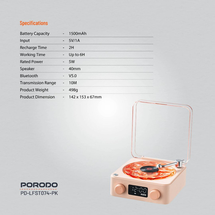 اسپیکر بلوتوثی پرودو مدل LFST074،اسپیکر پرتابل نویز Porodo Lifestyle همراهی ایدهآل برای آرامش، تمرکز و خواب شما خواهد بود.این دستگاه با یک باتری 1500 میلیآمپری مجهز شده که با هر بار شارژ 2 ساعته از طریق ورودی 5V/1A، تا 6 ساعت بیوقفه کار میکند. اسپیکر 40 میلیمتری و توان نامی 5 وات، صدایی شفاف و آرامشبخش را در این دستگاه قابلحمل تضمین میکند.با بهرهگیری از بلوتوث نسخه 5.0، این اسپیکر محدوده انتقال 10 متری را پشتیبانی کرده و اتصال بیسیم بینقصی را همراه با گزینههای مختلف پخش ارائه میدهد.صداهای طبیعی و نویز سفید این دستگاه، فضایی آرام برای خواب راحت و حتی جلسات مدیتیشن عالی را فراهم میکند. نورپردازی ملایم، محیطی دلپذیر و آرامشبخش ایجاد کرده و نمایشگر ساعت آن، کاربردی مضاعف برای میز کنار تخت یا فضای کاری شما به ارمغان میآورد.با طراحی جمع و جور و سبک، اسپیکر نویز سفید Porodo Lifestyle ترکیبی از عملکرد و زیبایی را ارائه میدهد که برای خانه، محل کار و سفر ایدهآل است.این گجت چندمنظوره را به همراه داشته باشید تا فضایی مملو از آرامش و تمرکز را تجربه کنید.