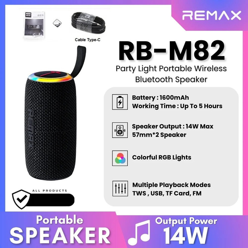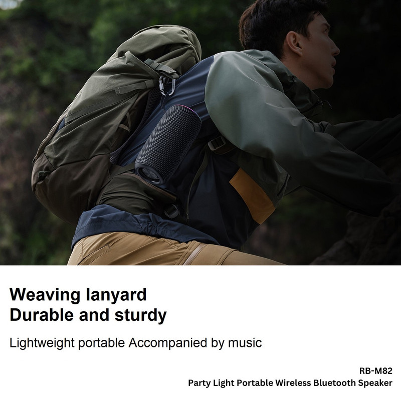 دارای طراحی جمع و جور با ابعاد 100 × 100 × 202 میلیمتر و وزن تنها 673 گرم است. با این ظاهر، حمل بلندگو آسان است و برای پیک نیک یا فعالیتهای خارج از منزل مناسب است.از پلاستیک ABS ضخیم و بادوام با جلوی پارچهای ساخته شده است.دارای بند پارچهای محکم و بافته شده آن است که حمل اسپیکر را در هر مکانی بدون نیاز به نگه داشتن یا قرار دادن آن در کیف یا کوله پشتی آسان میکند.این اسپیکر با ترکیب توان نامی 14 وات (2 عدد اسپیکر 7 واتی)، صدایی واضح با وضوح بالا و باس عمیق ارائه میدهد و تضمین میکند که حجم صدا به اندازه کافی بلند باشد تا جلسات، پیک نیک یا گوش دادن به موسیقی در خانه و...را با کیفیت HI-Fi بخوبی پوشش دهد.دارای میکروفون داخلی برای پاسخگویی به تماسها از طریق اسپیکر نیز می باشد.دارای استانداردضد آب IPX6 بوده و دارای چراغهای RGB با قابلیت تغییر رنگ است.این اسپیکر نه تنها از اتصال بیسیم از طریق بلوتوث نسخه ۵.۴ پشتیبانی میکند و اتصال پایدار را در برد ۱۰ متر تضمین میکند. علاوه بر این از پخش موسیقی از طریق کارت TF (کارت میکرو SD) و USB (فلش مموری) پشتیبانی میکند. و دارای حالت رادیو FM است که گزینههای پخش زیادی را برای کاربران فراهم میکند.به طور خاص، سازنده ویژگی TWS (استریو بیسیم واقعی) را نیز در خود جای داده است که به کاربران امکان میدهد دو بلندگوی RB-M82 را همزمان متصل کنند تا جلوه صوتی استریو واقعیتر و واضحتری ایجاد کنند. با TWS، دو بلندگو به طور همزمان کار میکنند، هر بلندگو مسئول یک کانال صدا (چپ و راست) است و یک تجربه صدای فراگیر کامل و غنی را ارائه میدهد. این ویژگی به افزایش کیفیت صدا، به ویژه هنگام استفاده در فضاهای بزرگ یا برگزاری مهمانیهای فضای باز، کمک میکند.این بلندگو به یک باتری ۱۶۰۰ میلیآمپر ساعتی مجهز شده است که تا ۵ ساعت استفده مداوم را فراهم میکند. زمان شارژ باتری از طریق پورت شارژ Type-C حدود ۳ تا ۳.۵ ساعت است که به کاربران کمک میکند بدون نیاز به انتظار طولانی، به سرعت به تجربه موسیقی ادامه دهند.