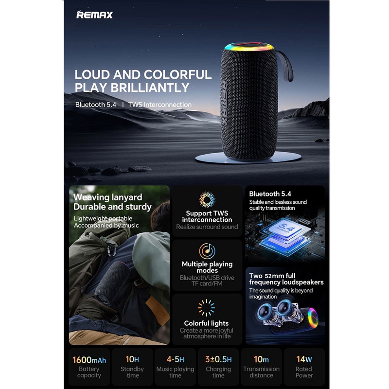 اسپیکر ریمکس RB-M82 یک بلندگوی بلوتوث قابل حمل برجسته است که طراحی پیشرفته و عملکرد چشمگیر را با هم ترکیب میکند. این محصول با دو بلندگوی فول رنج 52 میلیمتری، کیفیت صدای فوقالعادهای را ارائه میدهد