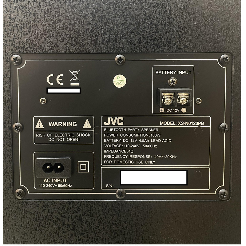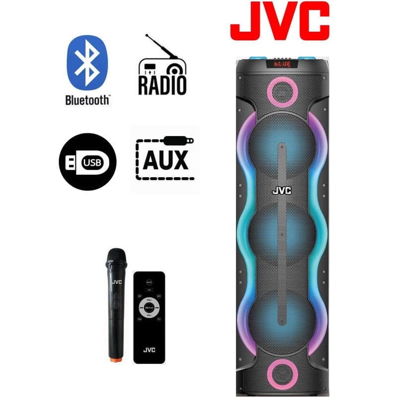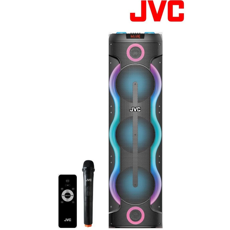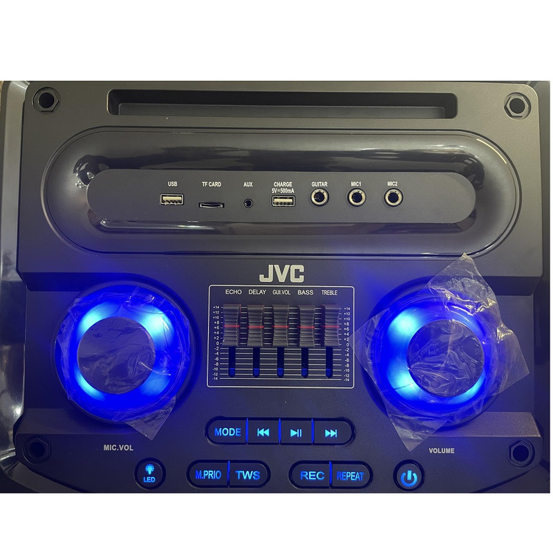 جی وی سی(JVC) شرکت ژاپنی می باشد که در سال 1927 (حدود 100سال) تاسیس شد.هم اکنون محصولات این شرکت در چین تحت لیسانس شرکت جی وی سی و با کیفیت اصلی تولید می گردد. اسپیکر بولوتوثی پارتی باکس قابل شارژ مدل XS-N6123PB از محصولات جدید شرکت جی وی سی می باشد که در سایز بزرگ( ارتفاع127سانتی متر) برای مهمانی های بزرگ طراحی شده است.این دستگاه دارای توان 2000وات P.M.P.O(100 وات خروجی) که 3 بلندگو 10اینچ(25سانتی متر)و یک درایو 1 اینچ داخلی می باشد.دو دستگیره در کنار دستگاه برای سهولت در جابجایی تعبیه شده است.زمان عملکرد باطری این دستگاه درصورت شارژ کامل حدودا 6 ساعت می باشد و زمان لازم برای شارژ شدن کامل این دستگاه حدود 1-1.5 ساعت می باشد.رنگ چراغ های ال ای دی این دستگاه قابل تغییرمی باشد و همچنین حساس به صدا و میکروفن جهت اجرای رقص نور می باشد ودرصورت عدم نیاز به ال ای دی می توان خاموش نمود.این دستگاه دارای سیستم TWS می باشد به این صورت که باداشتن دو دستگاه از این مدل اسپیکر و قرار دادن در حالت بلوتوث و فشردن این دکمه، بصورت همزمان دو دستگاه را به یکدیگر از طریق بلوتوث متصل می نماید .این دستگاه دارای ریموت کنترل، دو ورودی میکروفن،1 عدد میکروفن وایرلس،1 عدد ورودی AUX،ورودی flash USB (فلش های دارای ظرفیت حداکثر32 گیگابایت و فایل های mp3 را ساپورت می کند)،1عدد درگاه card TF- micro SD،درگاه شارژ USB وسایل الکترونیکی موبایل،تبلت و غیره می باشد. .دکمه Bass,Trebleجهت تنظیم باس و تربل موسیقی از مثبت تا منفی قابل تنظیم می باشند.دکمه REC این دستگاه قابلیت ضبط موسیقی همراه با خواننده(هنگام اجرا توسط میکروفن وایرلس یا میکروفن های باسیم که به دستگاه متصل می شوند) بر روی فلش USB یا TFT CARD فراهم می نماید به این صورت که با فشردن و نگه داشتن چند ثانیه دکمه REC شروع به ضبط صداها همراه با صدای موسیقی در حال پخش از دستگاه می نماید و بافشردن مجدد این دکمه قطع می نمایدو برای پخش یک بار دکمه REC را باید فشرد.این دستگاه دارای دکمه Priority می باشد که با زدن این دکمه هنگام خواندن با میکروفن ،دستگاه صدای آهنگ را بطور کامل قطع می کند.در پشت این دستگاه ورودی برق 220 ولت جهت روشن کردن دستگاه با برق و یا شارژ باطری،ورودی باطری 12 ولت جهت استفاده درمکان های کمپی و بیرون قراردارد