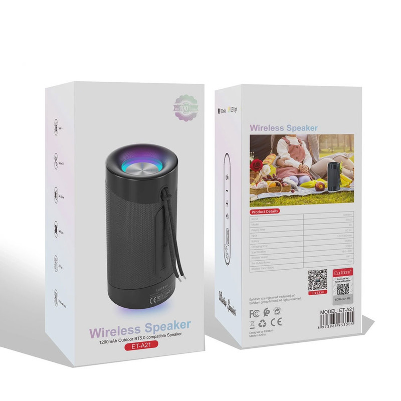 اسپیکر پرتابل ET-A21 نسل جدید اسپیکر های کمپانی Earldom است که دارای ویژگی های بسیاری می باشد. این اسپیکر دارای طراحی بسیار زیبا و متفاوتی است و به شکل جذابی لوگوی ارلدام بر روی آن حک شده است. در طراحی این اسپیکر از استایل خیابانی الهام گرفته شده است و میتوانید آن را داخل جیب خود حمل کنید. در قسمت بالای این اسپیکر یک قلاب یکپارچه حلقهای وجود دارد که حمل اسپیکر را آسان تر می کند. این اسپیکر دارای صدایی با وضوح عالی و بیس های کوبنده می باشد. برای اتصال به این اسپیکر می توانید از طریق بلوتوث به صورت بی سیم و با سیم متصل شده و موسیقی دلخواه خود را پخش کنید. این اسپیکر همراه دارای باتری داخلی قابل شارژ می باشد که قادر است تا 3 ساعت نیروی مصرفی اسپیکر را تامین کند.