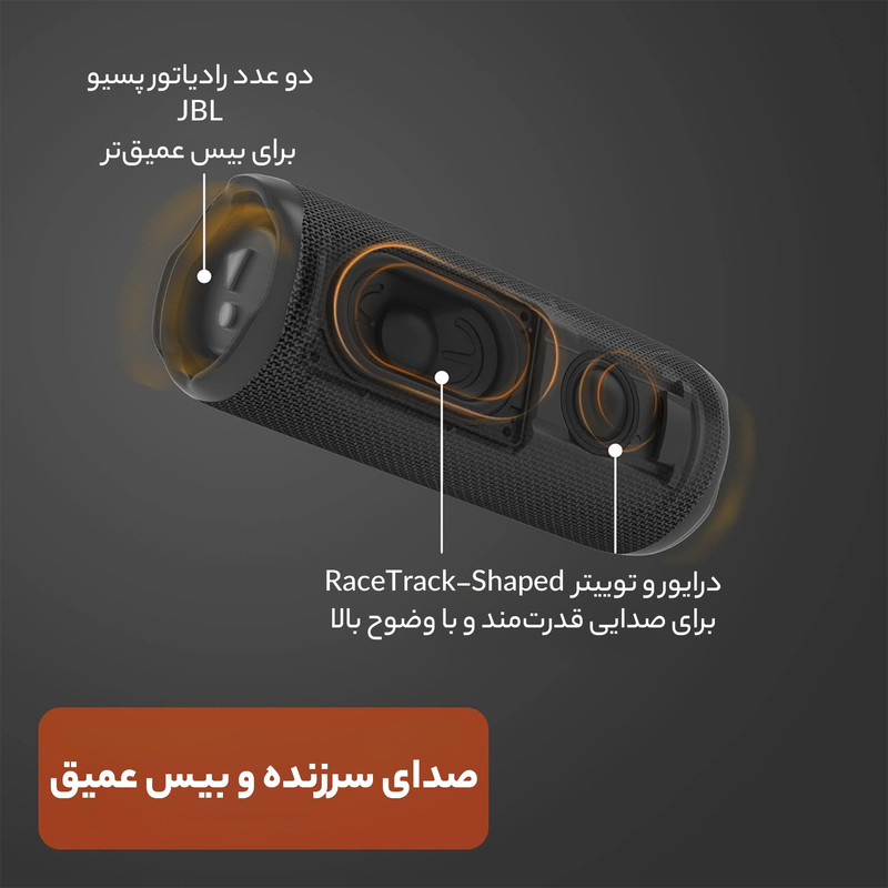 ویژگیهای برجستهی اسپیکر jbl فلیپ 6 شامل یک درایور بهینهشده به شکل (Racetrack-shaped)، یک توییتر جداگانه و دو رادیاتور بیس فعال است که با هم کار میکنند تا فرکانسهای پایین و میانی استثنایی و همچنین بیس عمیقی را تولید کنند، که با استفاده از الگوریتم پیشرفتهی هارمن به دقت تنظیم شدهاند.