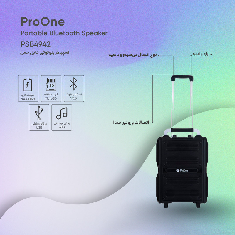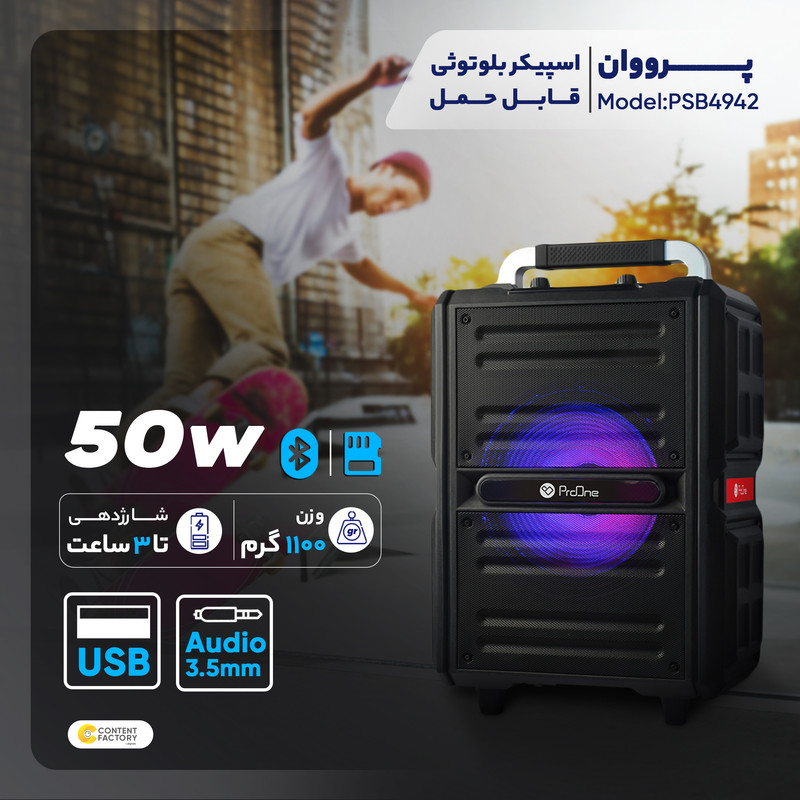 اسپیکرهای بلوتوثی از جمله پرفروشترین محصولات موجود در بازار هستند. این اسپیکرها میتوانند ابعاد بسیار کوچک و یا حتی بسیار بزرگ و اصطلاحاً چمدانی داشته باشند. مسلماً اسپیکرهای بزرگ بیشتر برای مهمانیها و مراسمها مورد استفاده قرار میگیرد. شرکت پرووان از جمله شرکتها شناخته شده در زمینهی تولید اسپیکرهای بلوتوثی است. اسپیکر بلوتوثی قابل حمل PSB4942 از محصولات بالا رده و قدرتمند این شرکت است که میتواند گزینهای مناسب برای جشنها باشد. این اسپیکر توان صوتی فوقالعاده بالای 50 واتی دارد و به راحتی برای استفاده در سالنهای بزرگ مناسب خواهد بود. علاوه بر این، پشتیبانی این اسپیکر بلوتوثی از بلوتوث 5.0، کارت حافظه، AUX و USB میتواند کاربری آن را سهولت ببخشد. از دیگر ویژگیهای قابل توجه اسپیکر بلوتوثی قابل حمل پرووان مدل PSB4942 میتوان به باتری 7000 میلیآمپری اشاره کرد. این میزان باتری میتواند تا سه ساعت شارژدهی داشته باشد.