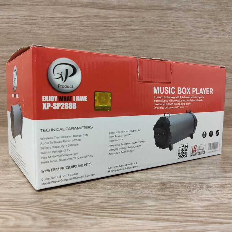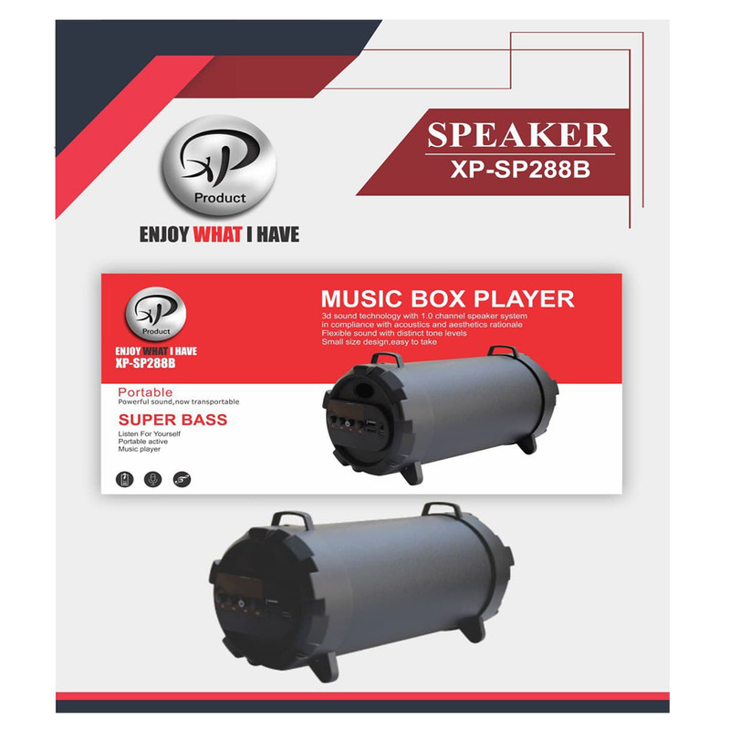 «SP288B» درواقع یک اسپیکر بلوتوثی پرقدرت از برند ایکس پی-پروداکت است. این محصول طراحی استوانه ای شکلی دارد که این طراحی باعث شده تا پخش صدای دایره ای با زاویه ی 360 درجه ای داشته باشید و تمام محیط اطراف را به صورت یکنواخت پوشش می دهد. در قسمت انتهایی این محصول چهار کلیدهای کنترل این محصول قرار گرفتهاند که شامل کلید پاور، آهنگ بعدی و قبلی و کلید تغییر وضعیت ورودی اسپپیکر هستند. در کنار کلید های کنترلی، یک درگاه USB برای اتصال فلش مموری، یک درگاه AUX، یک شیار کارت حافظه MicroSD و یک درگاه MicroUSB برای شارژ دستگاه دارد. برای استفاده از این محصول تنها کافی است که بلوتوث تلفن همراه خود را روشن و اسپیکر را به آن متصل کنید و یا از طریق خروجی AUX تلفن همراه را به آن متصل کنید. بدنه ی اسپیکر SP288B از جنس پلاستیک ABS با مقاومت بالا و همچنین یک لایه از چرم مصنوعی که حس لوکس و با کیفیتی را به کاربر الغا می کند.این بلندگو دارای خروجی ووفر می باشد. باتری SP288B ایکس پی پروداکت 1200 میلی آمپر ظرفیت دارد که در حدود سه ساعت ژخش موسیقی در صدای متوسط را به ارمغان می آورد.