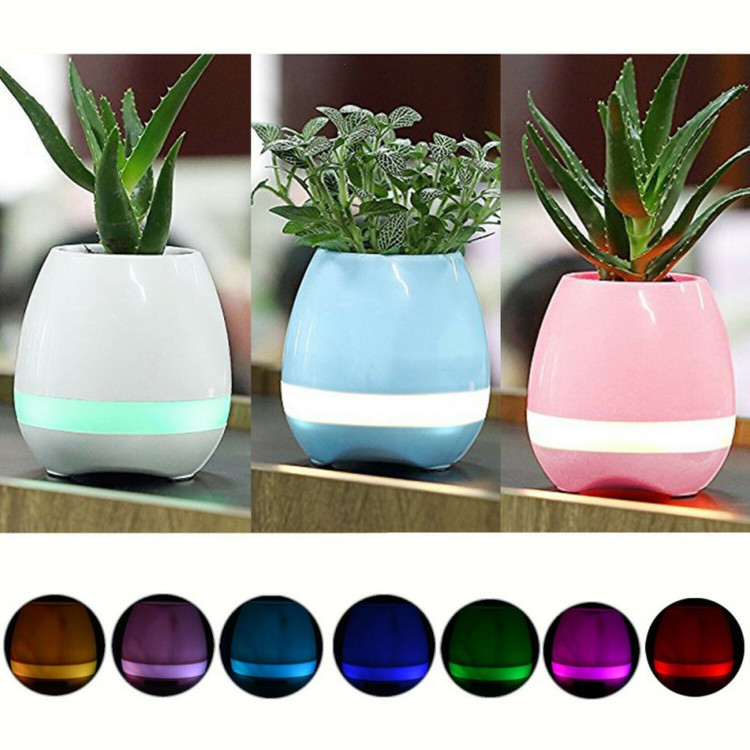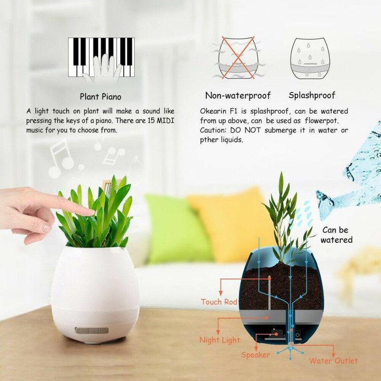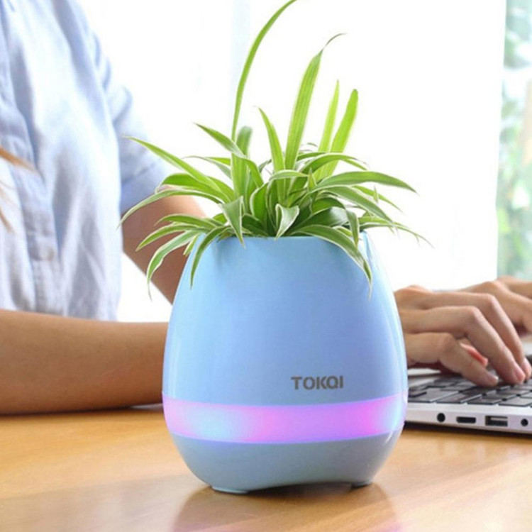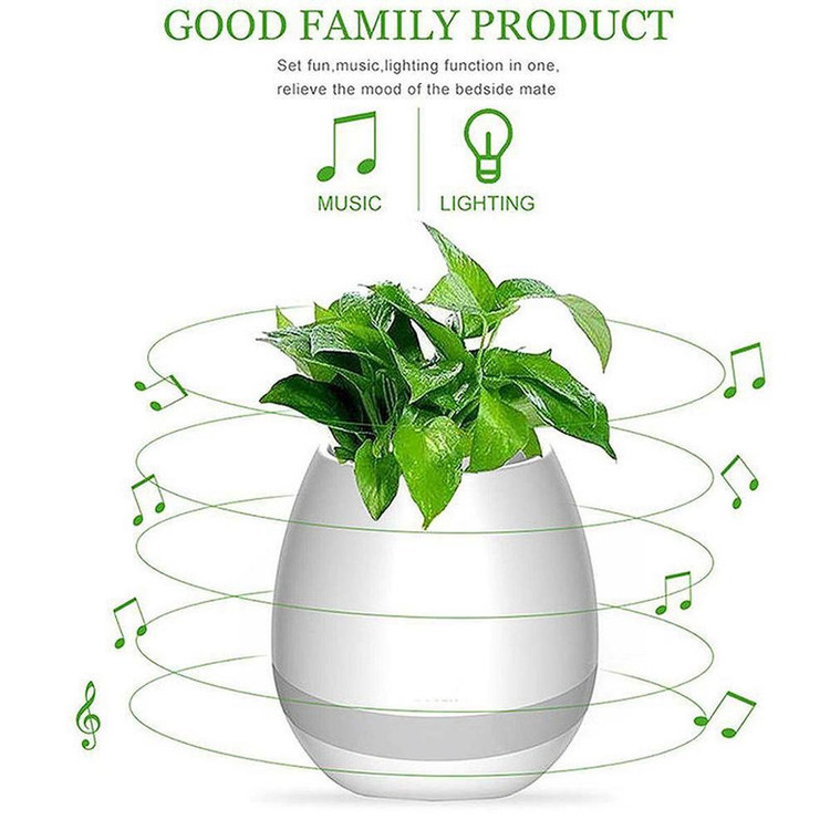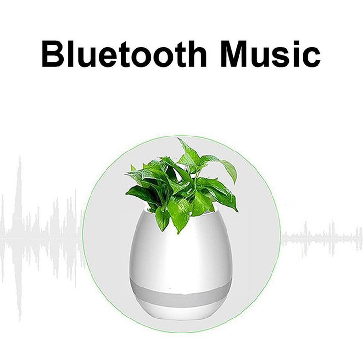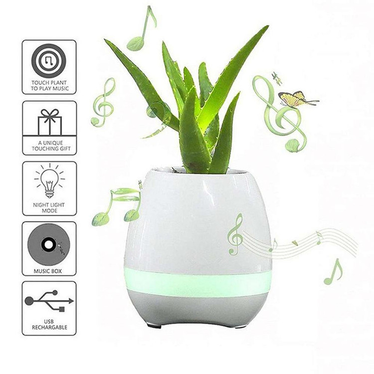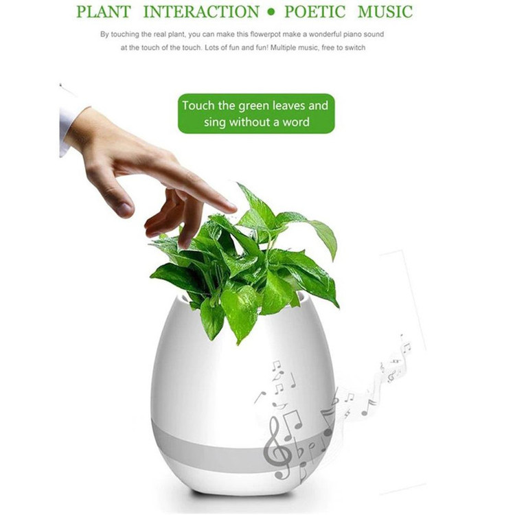 اسپیکر بلوتوث گلدانی اسمارت یک محصول بسیار شیک و چندکاره می باشد که به عنوان یک گلدان موزیکال لاکچری و همچنین اسپیکر هوشمند استفاده کنید. جنس بدنه این محصول پلاستیک ABS بوده و ابعاد آن 114x114x117 میلی متر و وزن آن 400 گرم است. همچنین به دلیل ارتفاع مناسب گلدان صدای این اسپیکر به صورت کاملا واضح و با کیفیت پخش میشود اسپیکر این دستگاه دارای قابلیت اتصال به بلوتوث با بُرد 10 متر می باشد. باطری محصول از نوع لیتیوم یونی با ظرفیت 1200 میلی آمپر ساعت است. مدت زمان لازم برای شارژ شدن گلدان موزیکال بلوتوث 4 ساعت بوده و پس از شارژ کامل قابلیت کارکرد به مدت 12 ساعت را دارد. این گلدان به شما این امکان را میدهد که گیاه خود را تبدیل به یک پیانو کنید؛ بنابراین شما می توانید گل مورد دلخواه خود را داخل گلدان قرار دهید و با دادن آب کم به گیاه خود، محیط خاک را مرطوب نمایید، سپس با تماس دست به هر برگ گیاه نوتهای پیانو پخش می گردد و شما می توانید موسیقی دلخواهتان را بر روی آن اجرا کنید. از طرفی می توانید از طریق بلوتوث موجود در گلدان به هر وسیله دیگری متصل شده و به موسیقی مورد نظرتان گوش دهید. همچنین این گلدان دارای سوراخی در قسمت پایینی آن است که مانع جمع شدن آبهای اضافی در خاک گلدان شما میشود.از طرفی چراغ LED هفت رنگ تعبیه شده در دور تا دور گلدان که نه تنها جلوه ای زیبا به گلدان شما می بخشد بلکه به عنوان چراغ خواب هم می توان از آن استفاده کرد. گلدان موزیکال اسپیکر را می توانید در محیط اتاق خواب، میز کار و یا حتی به عنوان یک هدیه بسیار زیبا و جالب به دوستان و آشنایان خود هدیه دهید.