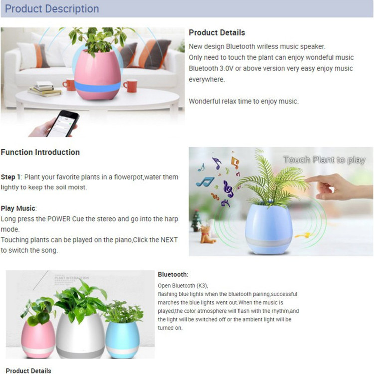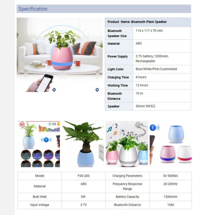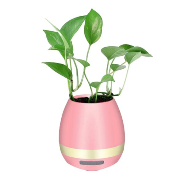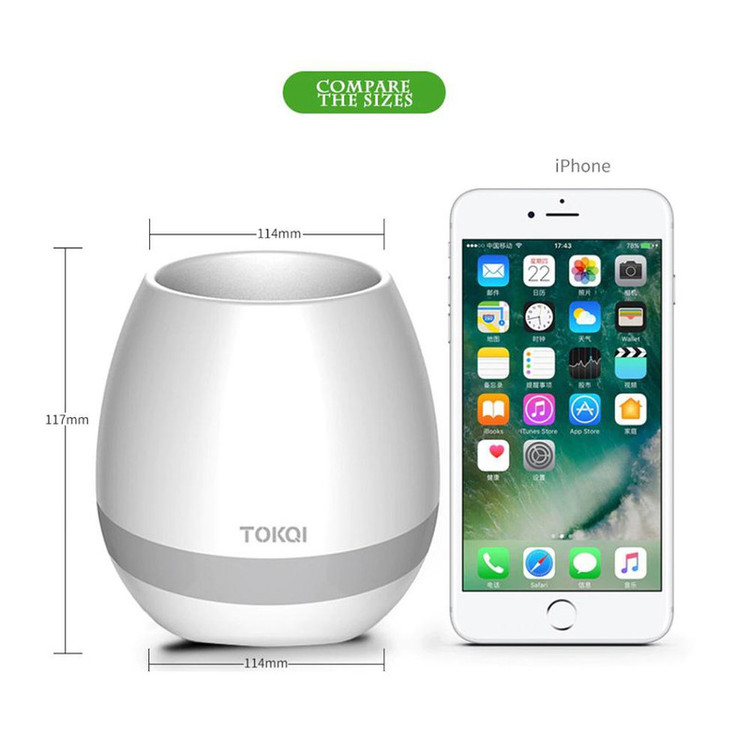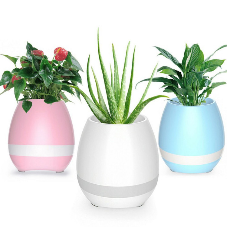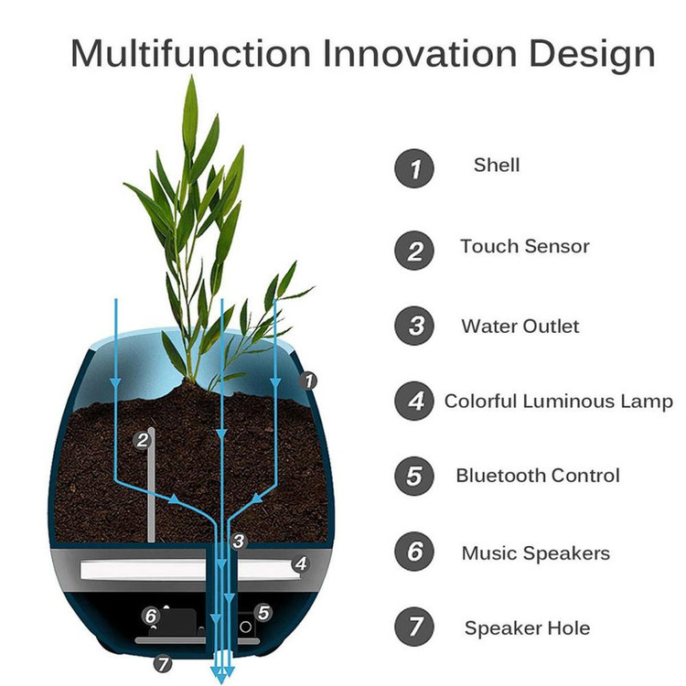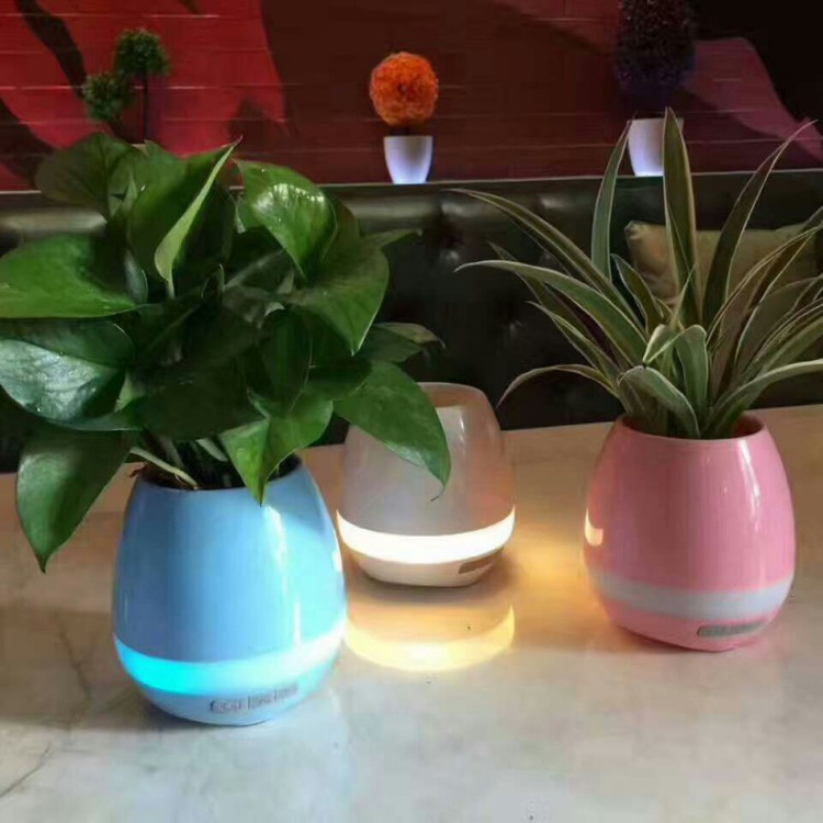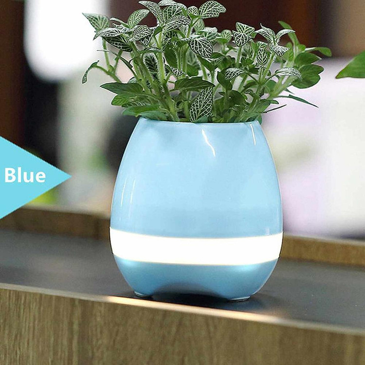 اسپیکر بلوتوث گلدانی اسمارت یک محصول بسیار شیک و چندکاره می باشد که به عنوان یک گلدان موزیکال لاکچری و همچنین اسپیکر هوشمند استفاده کنید. جنس بدنه این محصول پلاستیک ABS بوده و ابعاد آن 114x114x117 میلی متر و وزن آن 400 گرم است. همچنین به دلیل ارتفاع مناسب گلدان صدای این اسپیکر به صورت کاملا واضح و با کیفیت پخش میشود اسپیکر این دستگاه دارای قابلیت اتصال به بلوتوث با بُرد 10 متر می باشد. باطری محصول از نوع لیتیوم یونی با ظرفیت 1200 میلی آمپر ساعت است. مدت زمان لازم برای شارژ شدن گلدان موزیکال بلوتوث 4 ساعت بوده و پس از شارژ کامل قابلیت کارکرد به مدت 12 ساعت را دارد. این گلدان به شما این امکان را میدهد که گیاه خود را تبدیل به یک پیانو کنید؛ بنابراین شما می توانید گل مورد دلخواه خود را داخل گلدان قرار دهید و با دادن آب کم به گیاه خود، محیط خاک را مرطوب نمایید، سپس با تماس دست به هر برگ گیاه نوتهای پیانو پخش می گردد و شما می توانید موسیقی دلخواهتان را بر روی آن اجرا کنید. از طرفی می توانید از طریق بلوتوث موجود در گلدان به هر وسیله دیگری متصل شده و به موسیقی مورد نظرتان گوش دهید. همچنین این گلدان دارای سوراخی در قسمت پایینی آن است که مانع جمع شدن آبهای اضافی در خاک گلدان شما میشود.از طرفی چراغ LED هفت رنگ تعبیه شده در دور تا دور گلدان که نه تنها جلوه ای زیبا به گلدان شما می بخشد بلکه به عنوان چراغ خواب هم می توان از آن استفاده کرد. گلدان موزیکال اسپیکر را می توانید در محیط اتاق خواب، میز کار و یا حتی به عنوان یک هدیه بسیار زیبا و جالب به دوستان و آشنایان خود هدیه دهید.