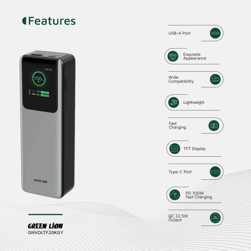 پاوربانک Green Lion Voltura 20000mAh PD100W طراحی جمعوجور و قدرتمندی دارد و توان بالا و شارژ سریع ارائه میدهد. باتری ۲۰۰۰۰ میلیآمپرساعتی آن برای تأمین انرژی دستگاههای شما کاملاً مناسب است. ورودی و خروجی Type-C (با توان PD100W) از شارژ سریع با مقادیر 5V/3A، 9V–15V/3A و 20V/5A پشتیبانی میکند. خروجی USB-A با توان QC 22.5W نیز امکان شارژ سریع دستگاههای دیگر مانند گوشیهای هوشمند را فراهم میکند. این پاوربانک همچنین دارای درگاههای Type-C + USB-A برای راحتی شارژ همهمنظوره است. صفحهنمایش TFT آن وضعیت شارژ را نشان میدهد، و ظاهر زیبا و سبک آن حملش را آسان کرده و با دستگاههای مختلف سازگاری گستردهای دارد. انتخابی مناسب برای کسانی که هنگام سفر یا بیرون از خانه به شارژ سریع و پایدار نیاز دارند.