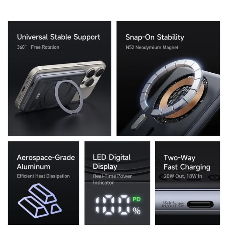 مشخصات فنی: •ولتاژ ورودی (Input): 5V⎓2A / 9V⎓2A (از طریق درگاه USB-C) •ولتاژ خروجی (Output): USB-C: 5V⎓3A / 9V⎓2.22A / 12V⎓1.67A (حداکثر 20W) بیسیم (Wireless): 5W / 7.5W / 10W (سازگار با MagSafe آیفون) •شدت جریان خروجی (Max Current): تا 3 آمپر (از درگاه USB-C)