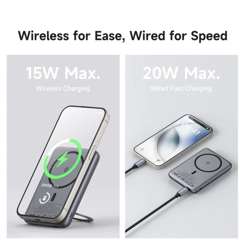 مشخصات فنی: •ولتاژ ورودی (Input): 5V⎓2A / 9V⎓2A (از طریق درگاه USB-C) •ولتاژ خروجی (Output): USB-C: 5V⎓3A / 9V⎓2.22A / 12V⎓1.67A (حداکثر 20W) بیسیم (Wireless): 5W / 7.5W / 10W (سازگار با MagSafe آیفون) •شدت جریان خروجی (Max Current): تا 3 آمپر (از درگاه USB-C)