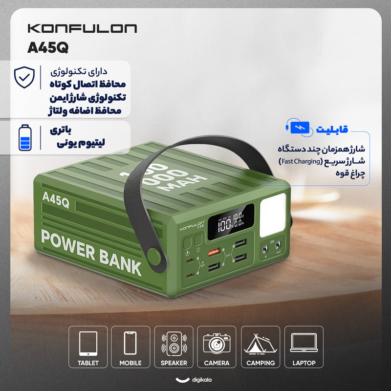 با داشتن چراغ قوه پر نور، این پاوربانک میتواند در شرایط تاریکی به عنوان یک چراغ قوه مفید عمل کند. به طور کلی، پاوربانک کانفلون مدل A45Q یک انتخاب عالی برای هر کسی است که به دنبال یک پاوربانک با عملکرد بالا و ایمنی برای استفاده کمپ و سفر و مسافرت است.