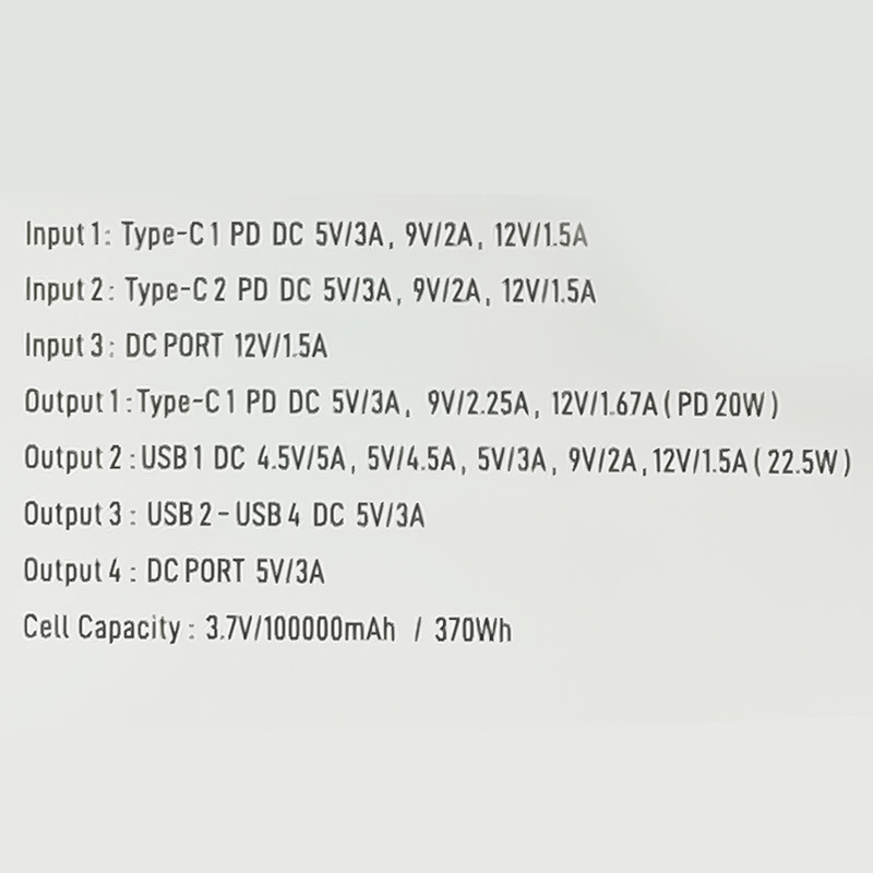 دارای محافظ ولتاژ اضافی، محافظ جریان کوتاه، محافظ اضافه شارژ و تخلیه شارژ - تشخیص خودکار جریان متناسب با دستگاههای متصل - دارای پورت DC ورودی و خروجی - دارای یک درگاه ورودی و خروجی و یک درگاه فقط ورودی از نوع Type-C - دارای 4 درگاه USB - دارای چراغ LED