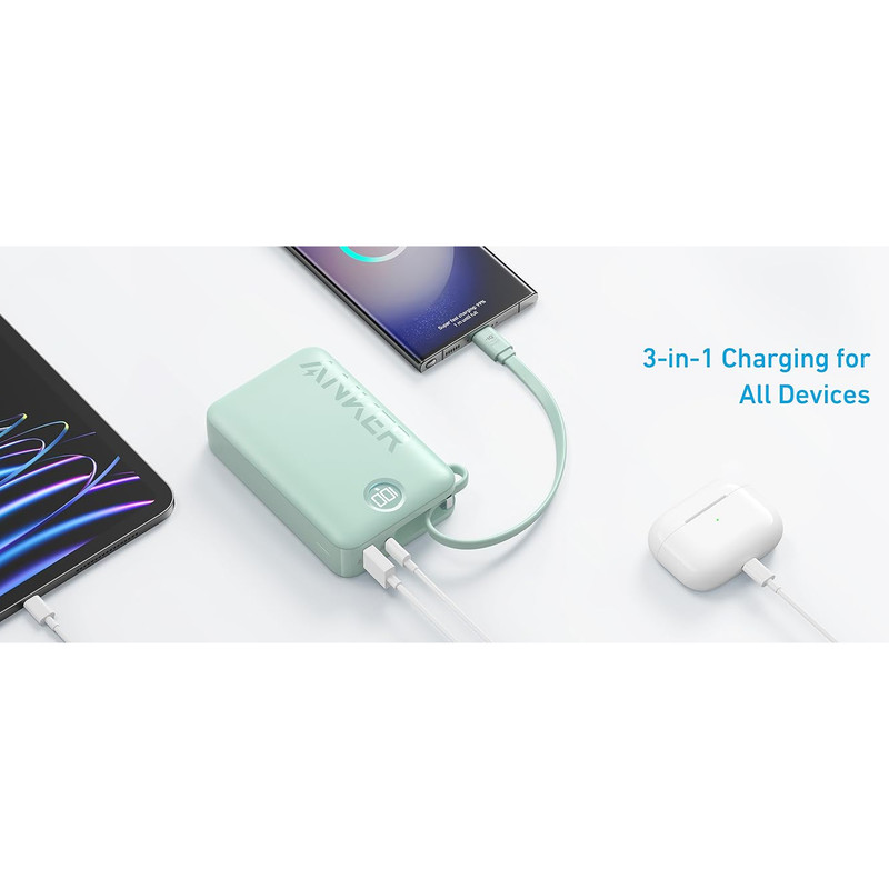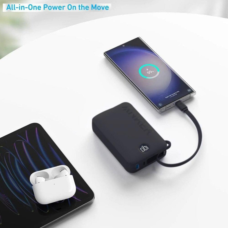 مشخصات فنی: قابلیت شارژ همزمان سه دستگاه مجهز به یک کابل چسبیده منحصر به فرد با توان in/out یک پورت USB-C و یک پورت USB-A