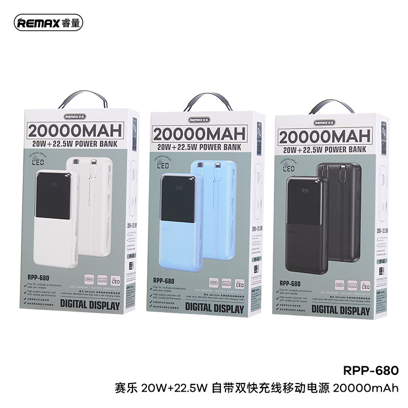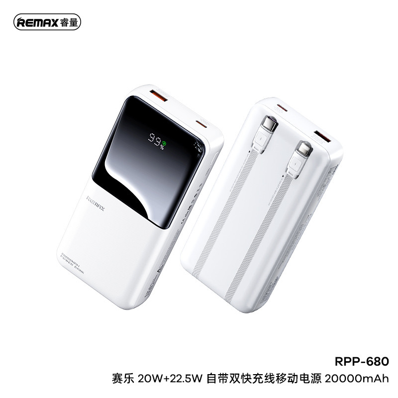 پاوربانک REMAX Cynlle Series RPP-680 با ظرفیت 20000 میلیآمپر ساعت یک انتخاب ایدهآل برای کسانی است که به دنبال شارژ سریع و کارآمد دستگاههای خود هستند. این پاوربانک مجهز به دو کابل شارژ سریع است: کابل Type-C که از شارژ سریع 22.5W پشتیبانی میکند و کابل IPH که به فناوری PD 20W مجهز است. این ویژگیها امکان شارژ سریع و ایمن چندین دستگاه را بهطور همزمان فراهم میآورد.
