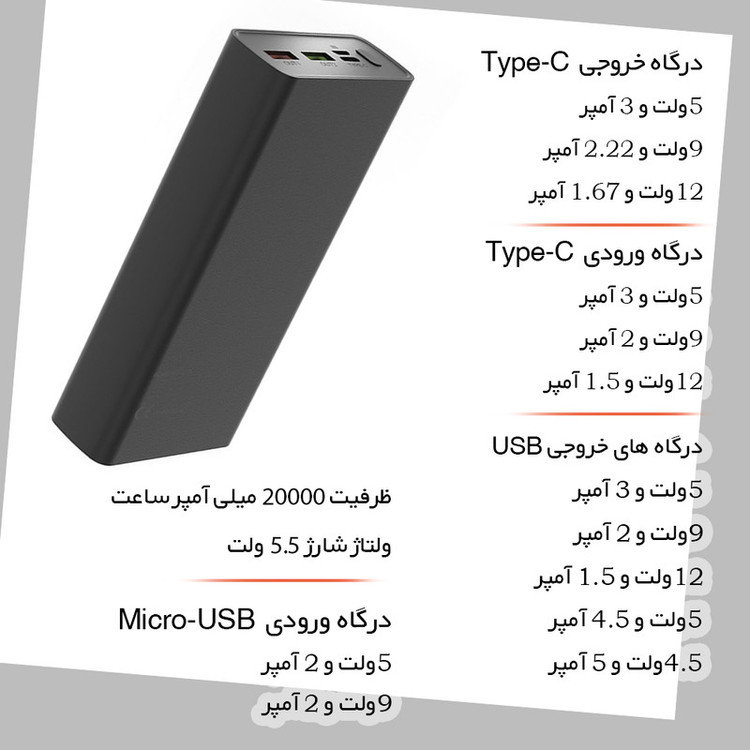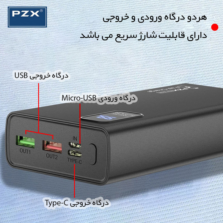 مشخصات فنی: برند معتبر PZX - ظرفیت 20هزار میلی آمپر ساعت - پشتیبانی از شارژ سریع 22.5 وات - تکنولوژی QC 3.0 - شارژ سریع PD - دارای 2 درگاه USB - دارای یک درگاه Type C - دارای یک درگاه میکرو USB