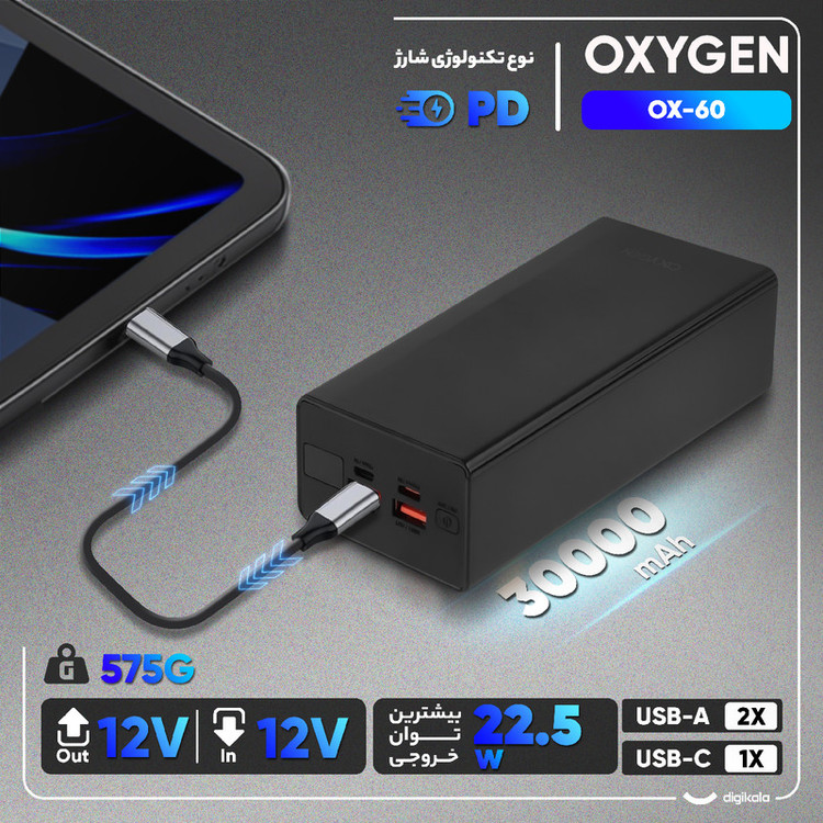 دارای یک پورت Micro USB ورودی با مشخصات 5 ولت 2 آمپر برای شارژ پاوربانک / دارای یک پورت USB-C مشترک برای ورودی خروجی با مشخصات 5V 3A و 9V 2A و 12V 1.5A / دارای دو پورت خروجی USB با مشخصات 4.5V 5A و 5V 3A و 9V 2A و 12V 1.65A / توان پاوربانک تا 22.5 وات