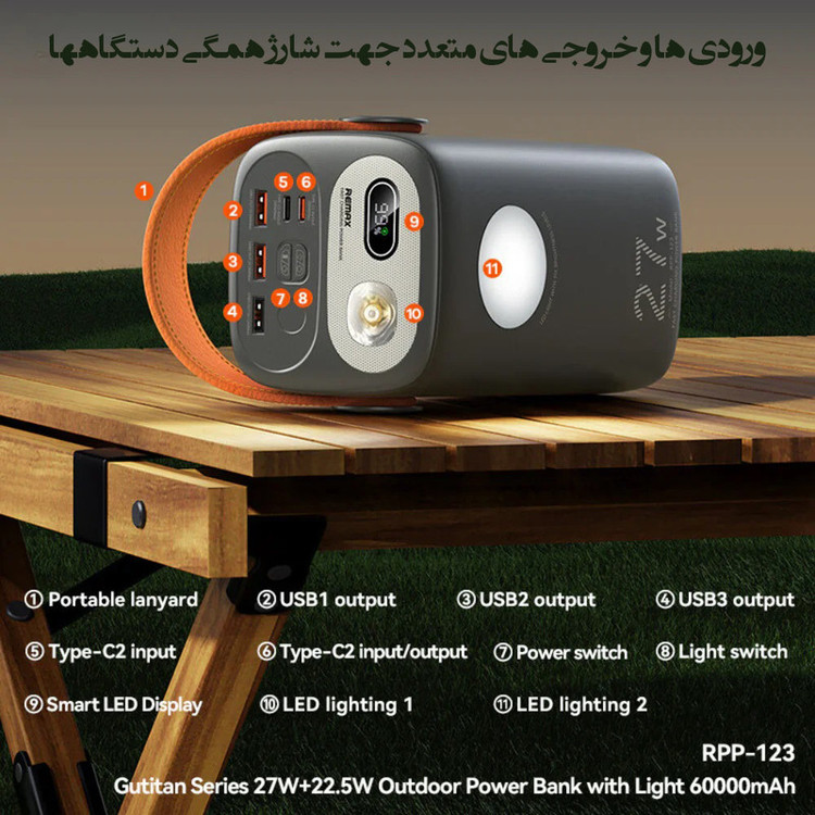 مشخصات فنی: 2 inputs, 4 outputs, TYPE-C for two-way fast charging Type-C1 for 27W PD fast charging; USB1/USB2 for 22.5W independent super fast charging