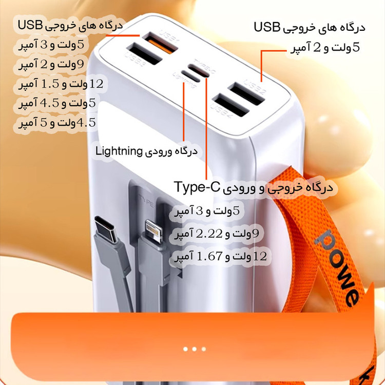 مشخصات فنی: برند معتبر PZX - ظرفیت 30هزار میلی آمپر ساعت - پشتیبانی از شارژ سریع 22.5 وات - دارای 4 درگاه USB - دارای یک درگاه Type C - دارای یک درگاه لایتنینگ - دارای دو عد کابل متصل (لایتنینگ و تایپ سی) - دارای چراغ قوه - دارای بند آویز