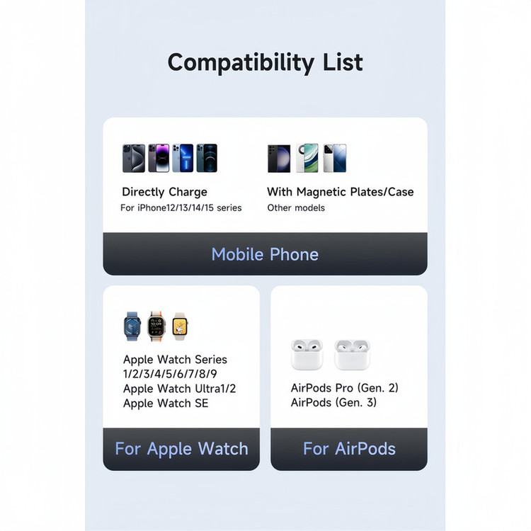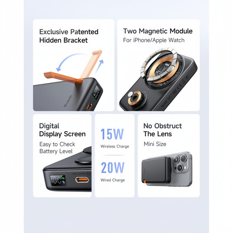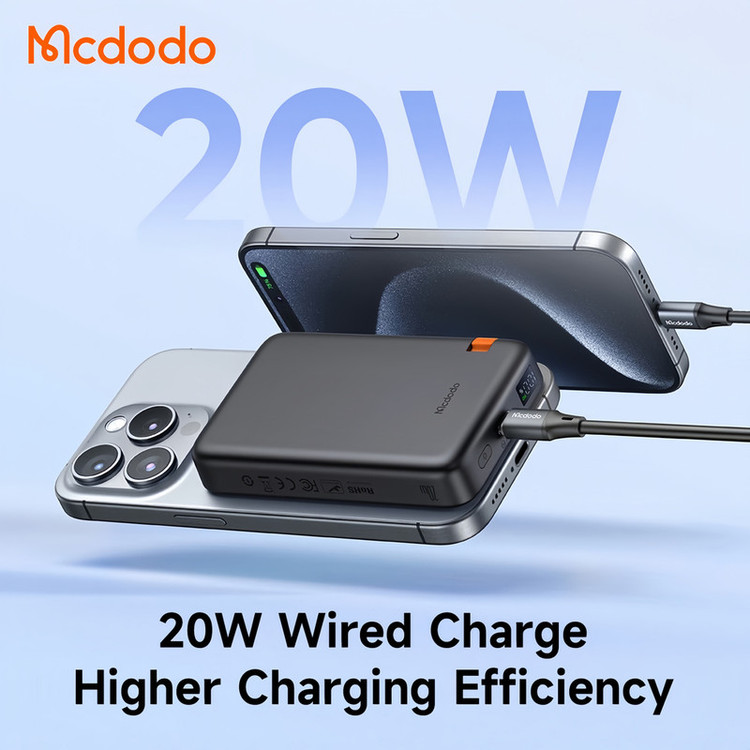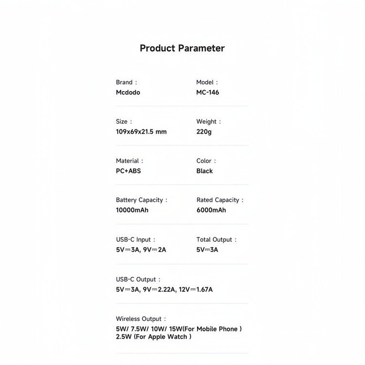 مشخصات فنی: ظرفیت باتری: 10000mAh لیتیوم-یونی ورودی: USB-C PD (20 وات) خروجی: شارژ بیسیم 15 وات، USB-C PD (20 وات) توان کلی: 15 وات شارژ بیسیم + 20 وات شارژ سریع مناسب برای: گوشیهای هوشمند، ایربادها، ساعتهای هوشمند نوع باتری: لیتیوم-یونی