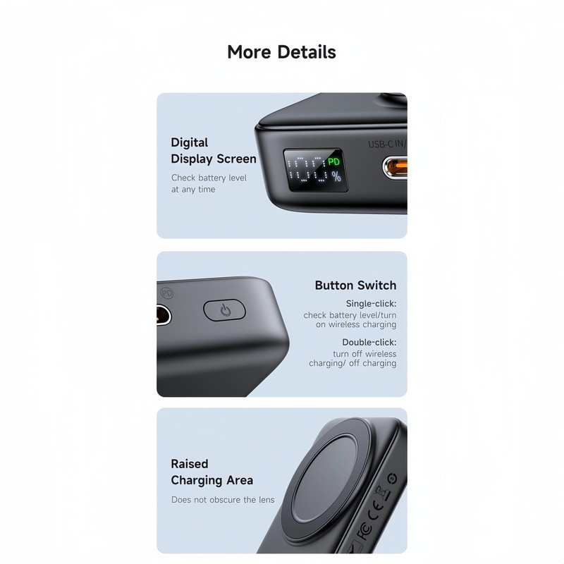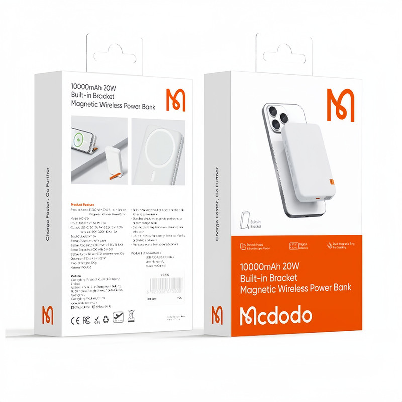 مشخصات فنی: ظرفیت باتری: 10000mAh لیتیوم-یونی ورودی: USB-C PD (20 وات) خروجی: شارژ بیسیم 15 وات، USB-C PD (20 وات) توان کلی: 15 وات شارژ بیسیم + 20 وات شارژ سریع مناسب برای: گوشیهای هوشمند، ایربادها، ساعتهای هوشمند نوع باتری: لیتیوم-یونی