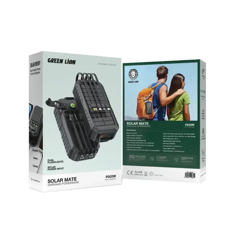 Power Bank Solar Mate Green Lion همراه همه کاره شماست که برای کمپینگ و مواقع اضطراری عالی است. ظرفیت قدرتمند 20000 میلی آمپر ساعتی با گزینه های شارژ به شما امکان می دهد همه دستگاه های خود را در حال حرکت نگه دارید. دارای شارژ سریع QC22.5W و PD20W برای تحویل سریع نیرو، به همراه پنل های خورشیدی داخلی و میل لنگ دستی برای شارژ خارج از شبکه است. این واقعاً ناهموار است و از مواد قوی و نسوز ABS + PC با درجه IP ساخته شده است. این پاوربانک دارای مجموعه ای از چهار کابل داخلی، یک چراغ قوه دوگانه، یک قطب نما و یک گرادیان است تا شما را برای هر کاری آماده کند.
