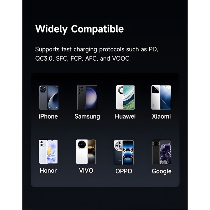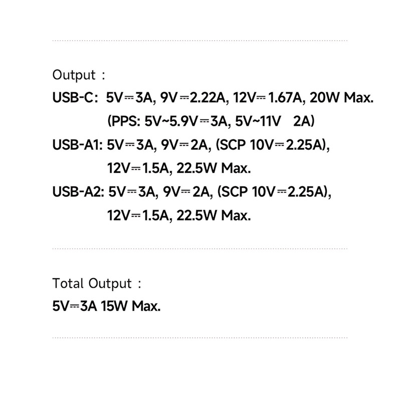 مشخصات فنی: دارای سه پورت خروجی شارژ : درگاه خروجی 20 واتی تایپ سی | 2 درگاه خروجی 22.5 واتی USB-A1 / USB-A2 | Total ouput (15W) : 5V~3A (USB-C +USB-A)