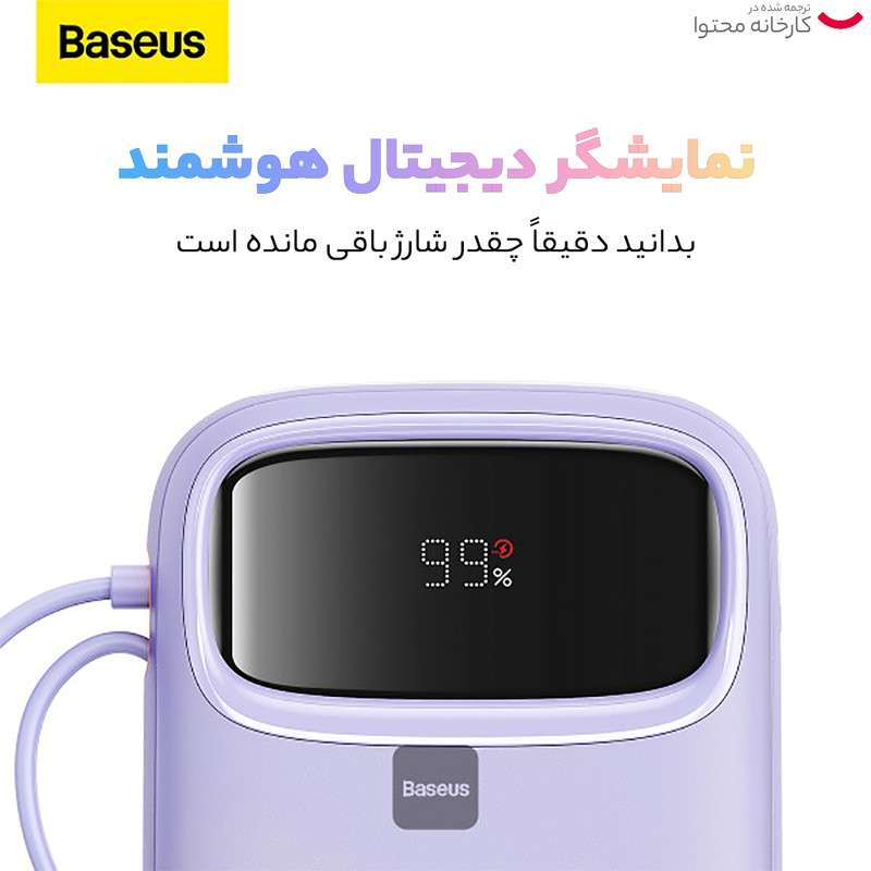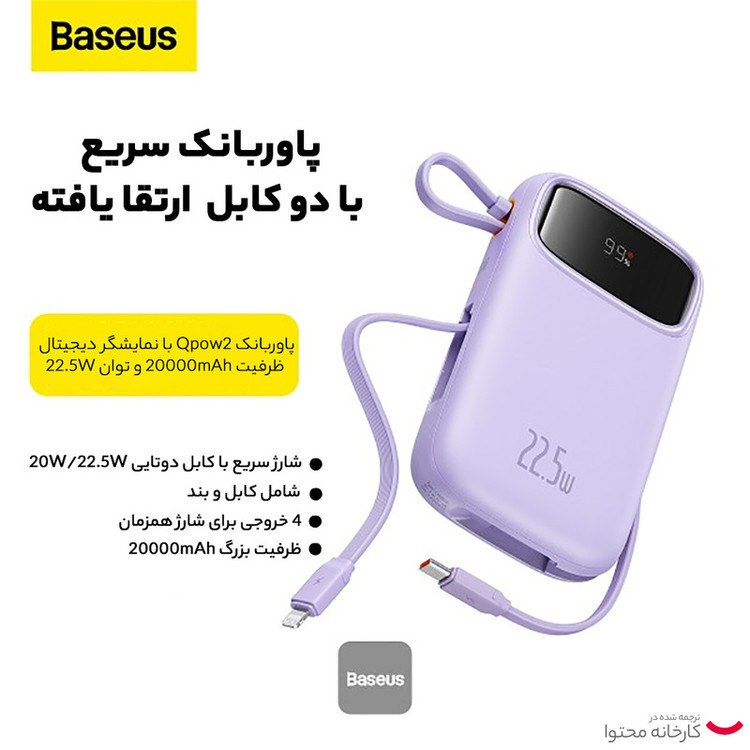 برای کابل Type-C داخلی: 5V ⎓ 2.4A ؛ 9V ⎓ 2A ؛ 12V ⎓ 1.5A برای کابل Lightning داخلی: 5V ⎓ 2.4A ؛ 9V ⎓ 2.22A برای پورت USB-A خارجی: 5V ⎓ 2.4A