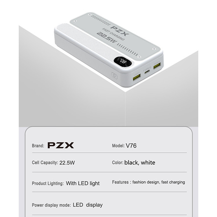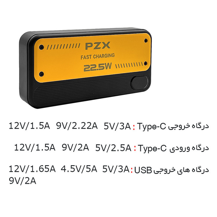 مشخصات فنی: برند معتبر PZX - ظرفیت 20 هزار میلی آمپر ساعت - قابلیت شارژ سریع - شارژ 22.5 وات - تکنولوژی شارژ PD (تنظیم هوشمند برق موردنیاز توسط پاوربانک برای دستگاه) - دارای نمایشگر میزان شارژ به درصد - دارای دو درگاه خروجی USB - یک درگاه Type C