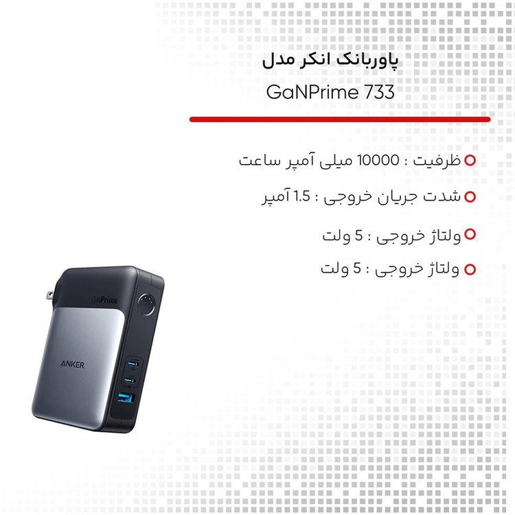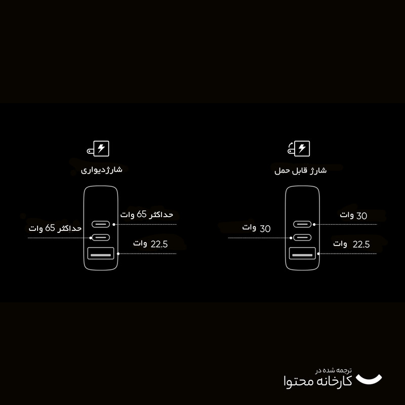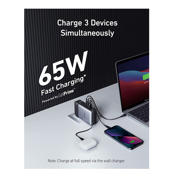 خروجی: حداکثر 65 وات تعداد پورت: 2 پورت USB-C تعداد پورت: 1 پورت USB-A تعداد خروجی ها: 3