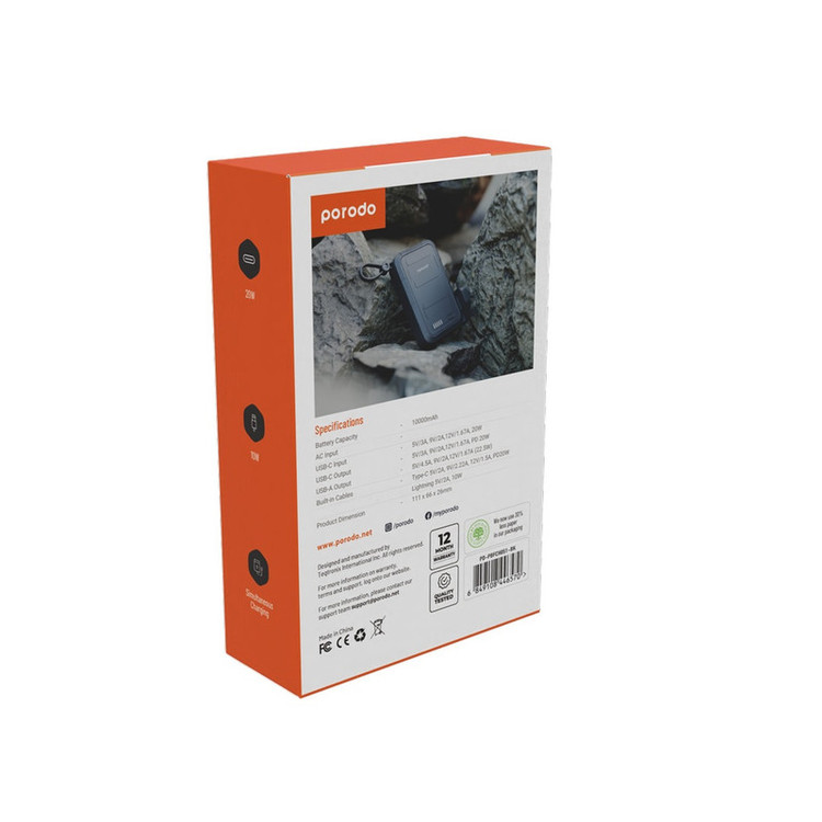 پاوربانک و شارژر دیواری Porodo از مواد بادوام ABS+PC ساخته شده است که می تواند به خوبی ساییدگی و ضربه را تحمل کند
