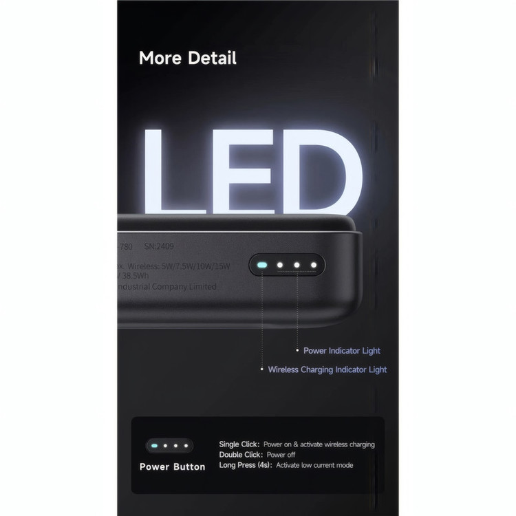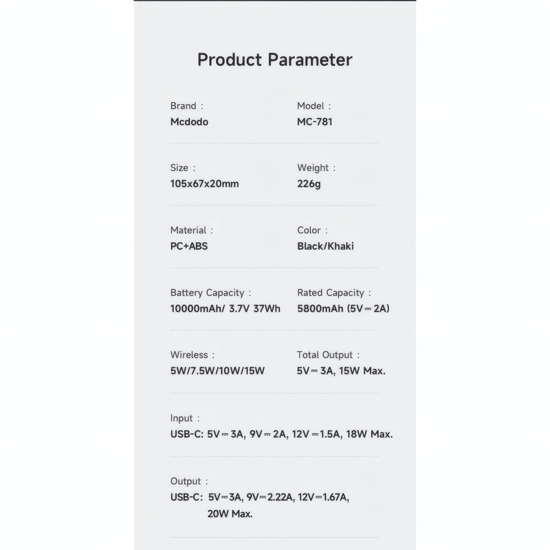 مشخصات فنی: ابعاد: 20×67×105 میلیمتر وزن: 226 گرم ظرفیت اسمی: 10000 میلیآمپر ساعت جنس بدنه: پلیکربنات + پلاستیک ABS درگاه ورودی: تایپ C (حداکثر 18 وات) درگاه خروجی: تایپ C (حداکثر 30 وات) و پد شارژ وایرلس (حداکثر 15 وات)