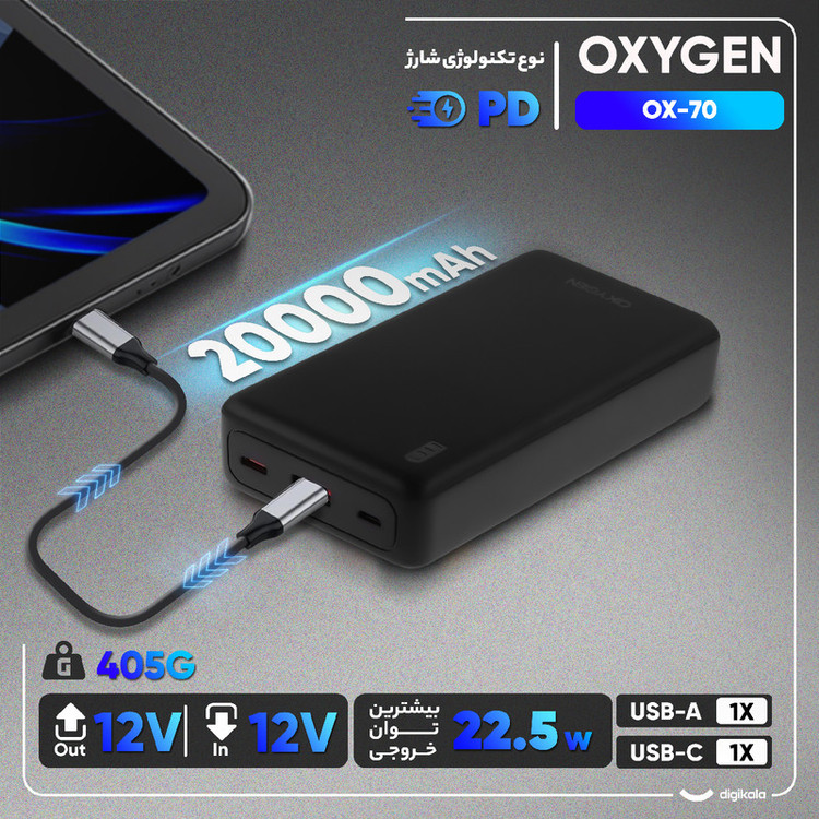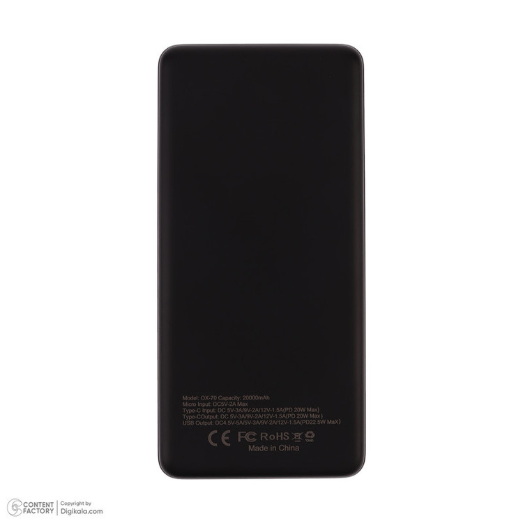 دارای یک پورت Micro USB ورودی با مشخصات 5 ولت 2 آمپر برای شارژ پاوربانک / دارای یک پورت USB-C مشترک برای ورودی خروجی با مشخصات 5V 3A و 9V 2A و 12V 1.5A / دارای یک پورت خروجی USB با مشخصات 4.5V 5A و 5V 3A و 9V 2A و 12V 1.65A / توان پاوربانک تا 22.5 وات