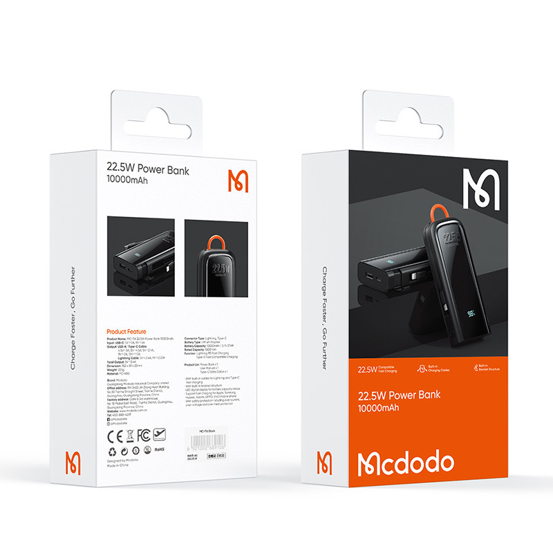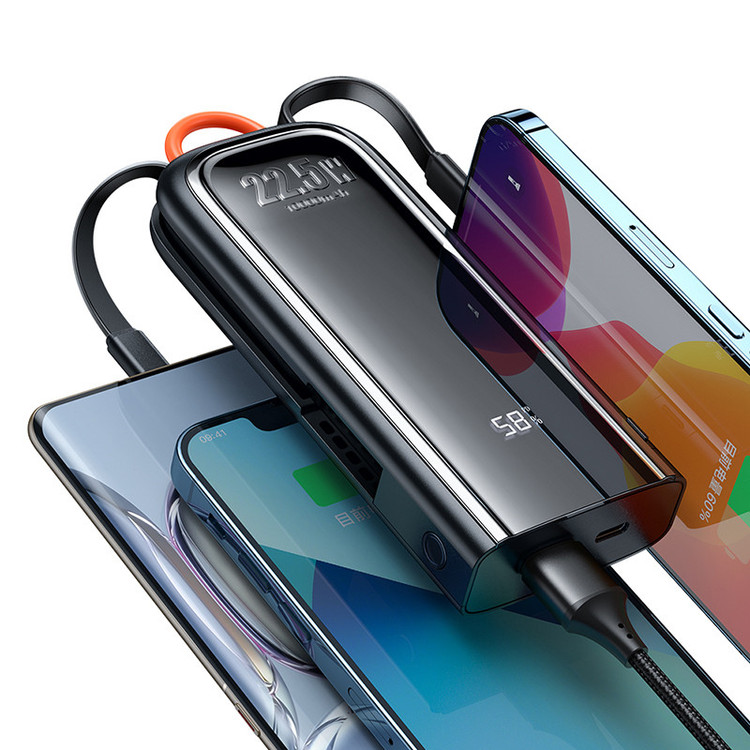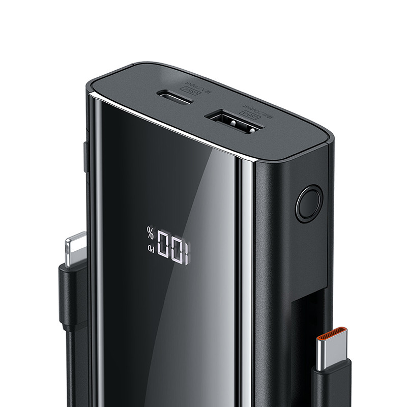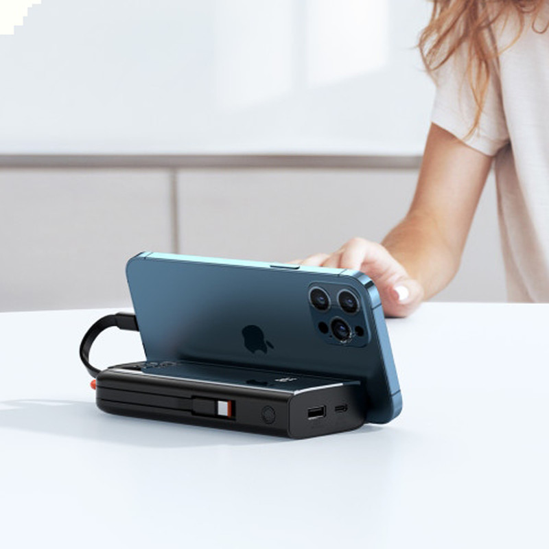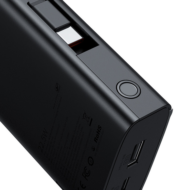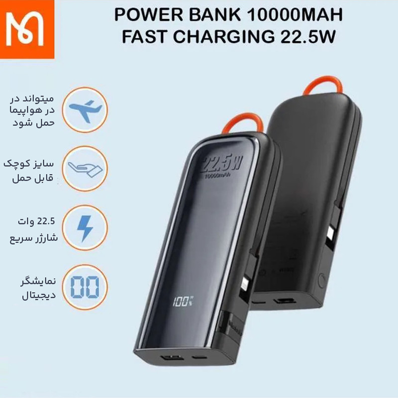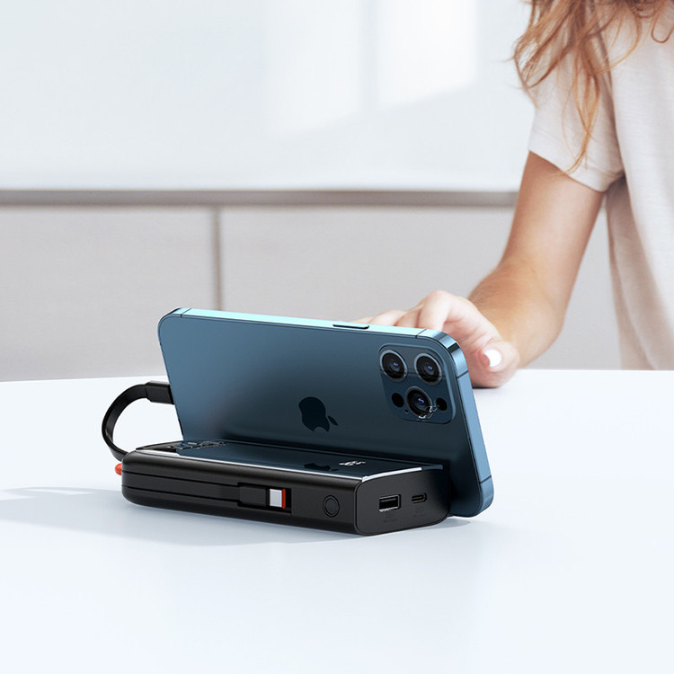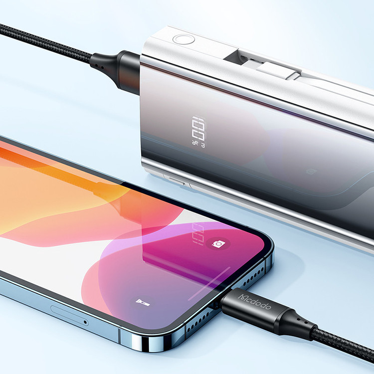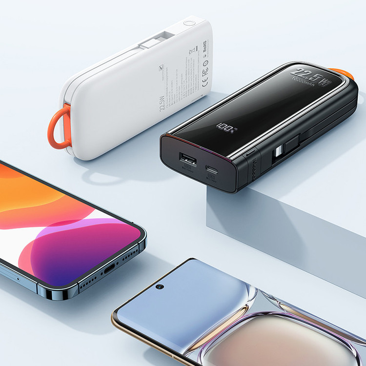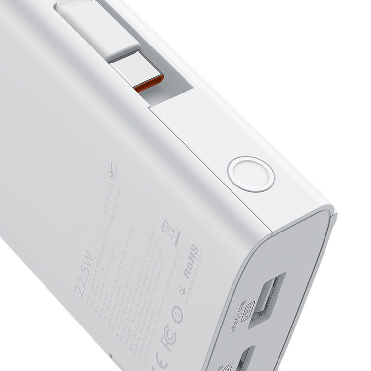 دارای کابل متصل به بدنه لایتنینگ و تایپ سی شارژ سریع با توان 22.5 وات دارای خروجی USB.A