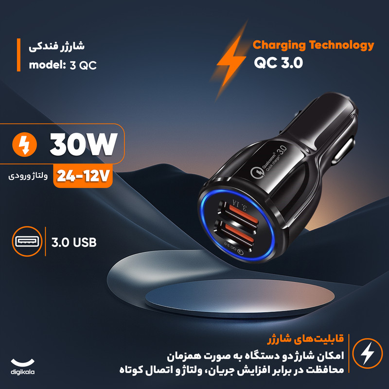 شارژر فندکی 6A با دو پورت خروجی، مجهز به تکنولوژی شارژ سریع و ایمن QC 3.0 هست. در تکنولوژی Quickcharge ورژن 3.0 استفاده شده در این محصول سرعت شارژ 4 برابر حالت عادی است. توسط دو پورت USB به کار برده شده در این شارژر به طور همزمان میتوان 2 دستگاه مختلف را شارژ نمود. پورت اول این دستگاه متناسب با دستگاه متصل شده به آن به طور هوشمند در ولتاژ 5 ولت جریان خروجی 3.1 آمپر، در ولتاژ 9 ولت جریان 2 آمپر و در ولتاژ 12 ولت جریان 1.6 آمپر را تولید میکند؛ همچنین پورت دوم این دستگاه نیز ولتاژ 5 ولت و جریان خروجی 3.1 آمپر را تولید میکند. با توجه به پشتیبانی این دستگاه از ولتاژهای مختلف میتوان تمامی دستگاه هایی که توسط پورت USB شارژ میشوند را شارژ کرد. برای استفاده از این محصول کافی است آن را به درگاه فندک داخل ماشین متصل کنید که به محض برقراری اتصال نشانگر LED روی بدنه روشن میشود. لازم به ذکر است باتوجه به تکنولوژی شارژ ایمن به کار رفته در این شارژر فندکی از دستگاههای متصل به این شارژر در برابر افزایش ناگهانی ولتاژ، جریان و دما محافظت میشود و از نوسانات جریانی ممانعت به عمل میآید به همین دلیل هیچ گونه آسیبی دستگاههای متصل به این شارژر فندکی را تهدید نخواهد کرد.