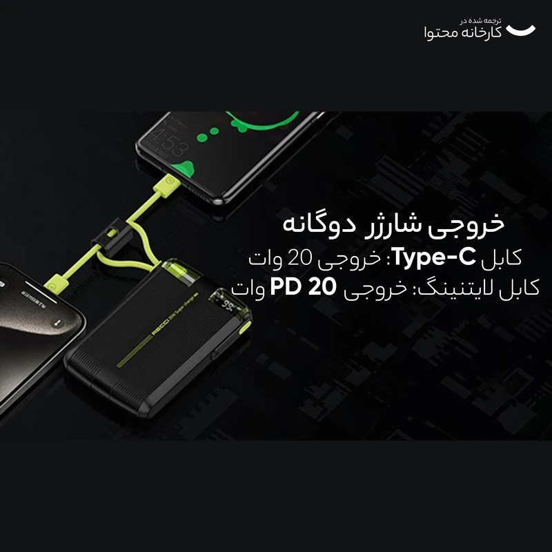 مشخصات فنی: قابلیت شارژ شدن به وسیله پورت تایپ سی با توان : 3A / 2A / 1.5A | قابلیت شارژ با کابل متصل به بدنه با توان : 5A / 4.5A / 3 / 2A / 1.5A
