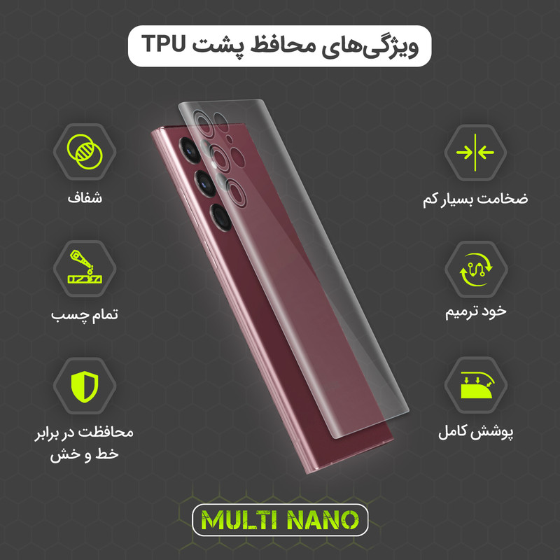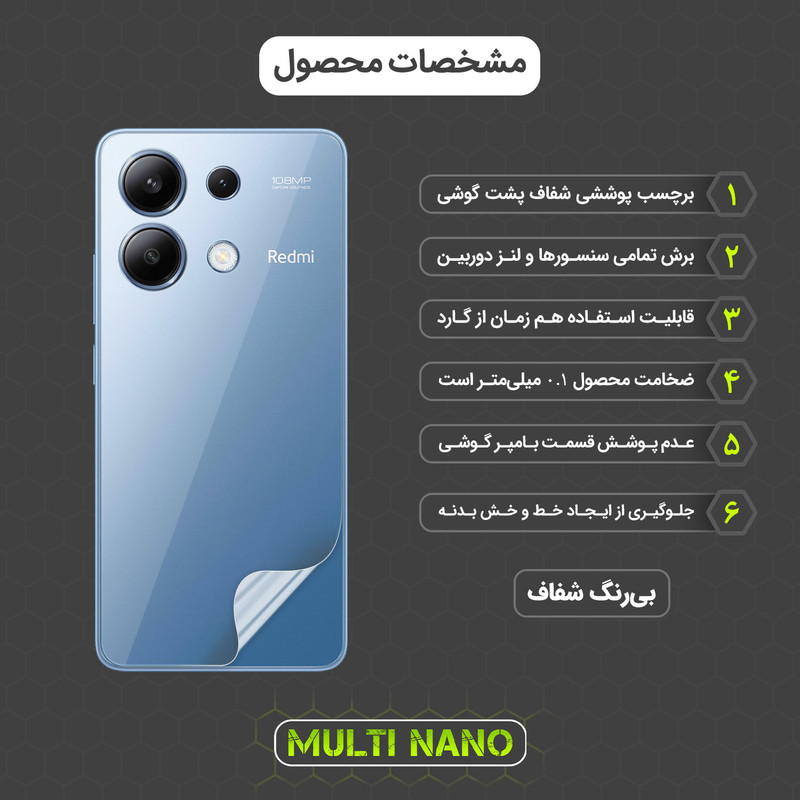 شامل یک عدد محافظ پشت گوشی - پد الکلی - برچسب پرز بردار - دستمال مناسب برای تمیز کردن گوشی - کارت نصب - آموزش نصب