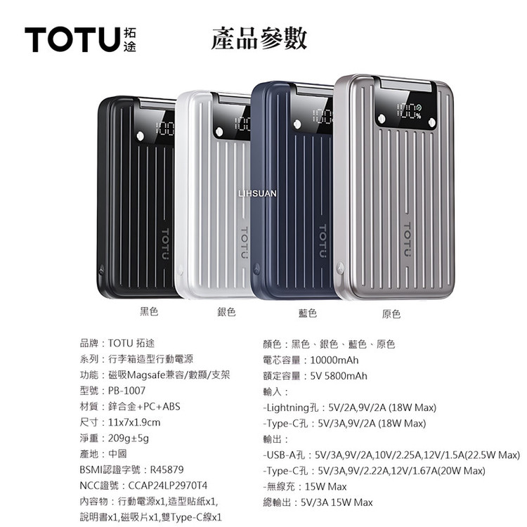 مشخصات فنی: Battery capacity: 10000mAh Input: -Lightning:5V/2A,9V/2A (18W Max) -Type-C:5V/3A,9V/2A (18W Max) Output: -USB-A:5V/3A,9V/2A,10V/2.25A,12V/1.5A(22.5W Max) -Type-C:5V/3A,9V/2.22A,12V/1.67A(20W Max) -Wireless charging: 15W Max