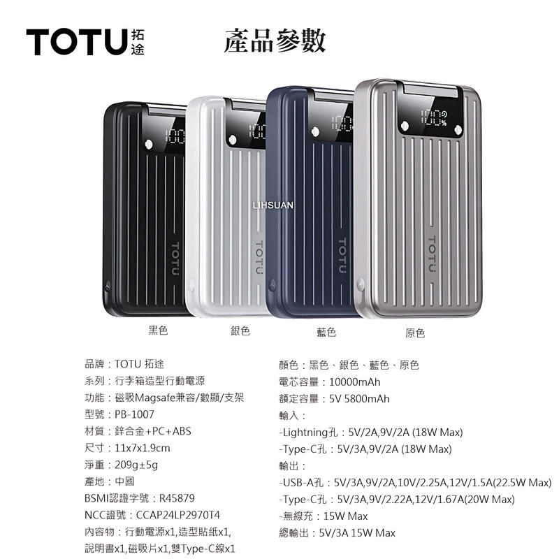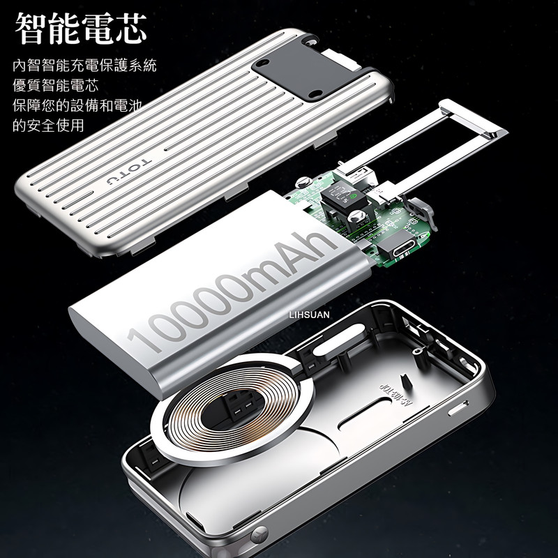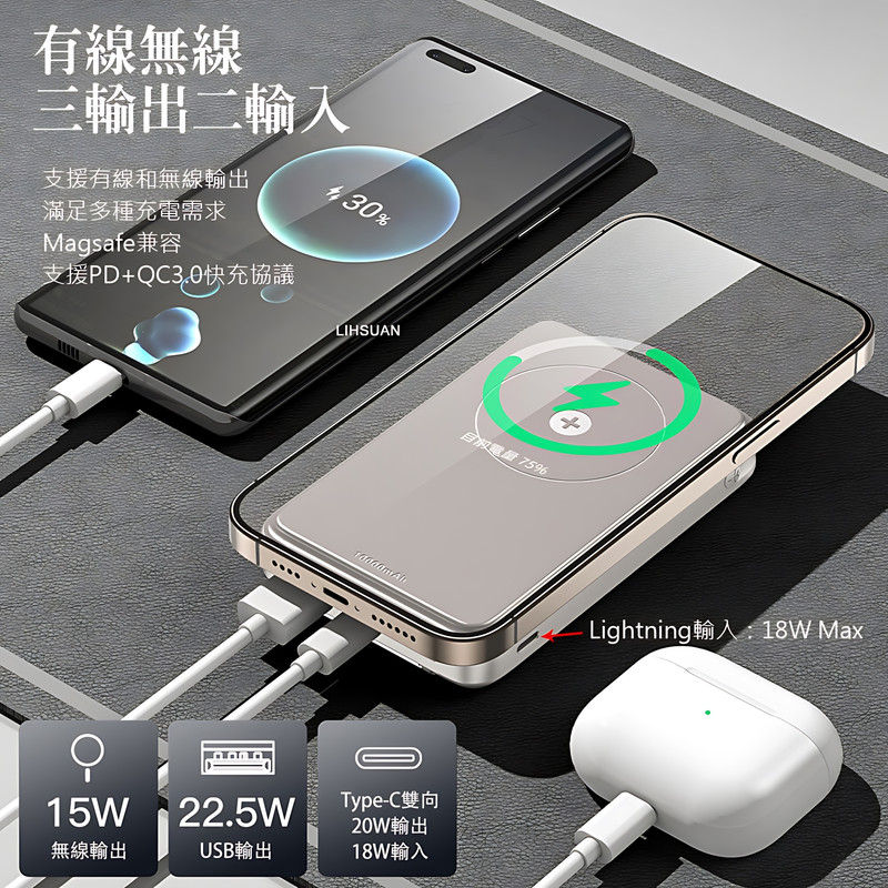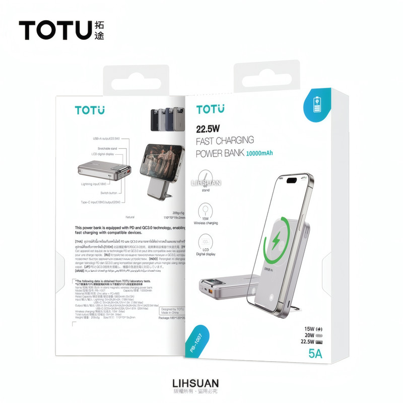 مشخصات فنی: Battery capacity: 10000mAh Input: -Lightning:5V/2A,9V/2A (18W Max) -Type-C:5V/3A,9V/2A (18W Max) Output: -USB-A:5V/3A,9V/2A,10V/2.25A,12V/1.5A(22.5W Max) -Type-C:5V/3A,9V/2.22A,12V/1.67A(20W Max) -Wireless charging: 15W Max
